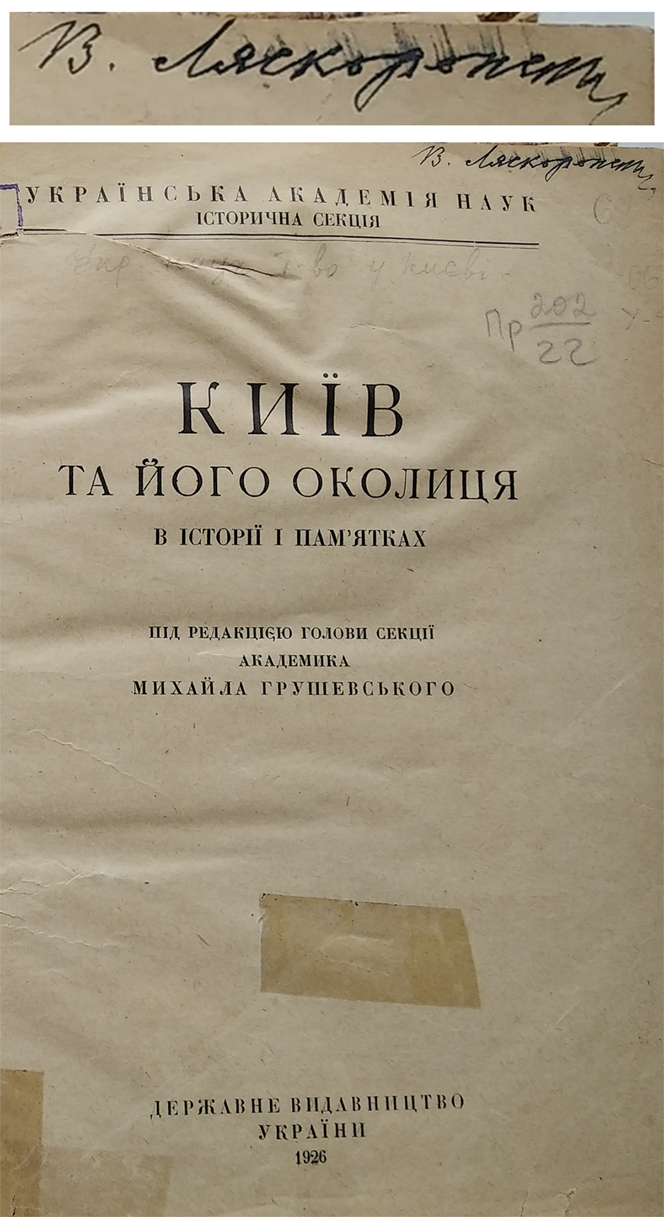 3. Київ та його околиця в історії і пам’ятках / під ред. М. Грушевського. – Київ : Держвидав України, 1926. – 474 с., іл., табл. – (Записки Українського наукового товариства в Київі (тепер Історичної секції Української Академії наук) ; т. 22). Особливості примірника : [Текст автогр.]: «В Ляскоронський».