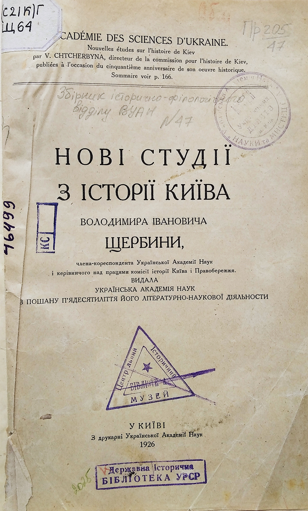 15. Щербина В. Нові студії з історії Київа / В. І. Щербина ; авт. передм. М. С. Грушевський; авт. вст. ст. С. Глушко, С. Шамрай, К. Антипович ; Українська академія наук. – Київ : друк. Укр. акад. наук, 1926. – XXXIX, 164, [2] с., фот. Особливості примірника : [Шт.]: «Zentralbibliothek der hohen Schule»; [Шт.]: «Українська Академія Наук. Музей українських діячів науки та мистецтва. м. Київ» ; [Шт.]: «Центральний історичний музей. Бібліотека».