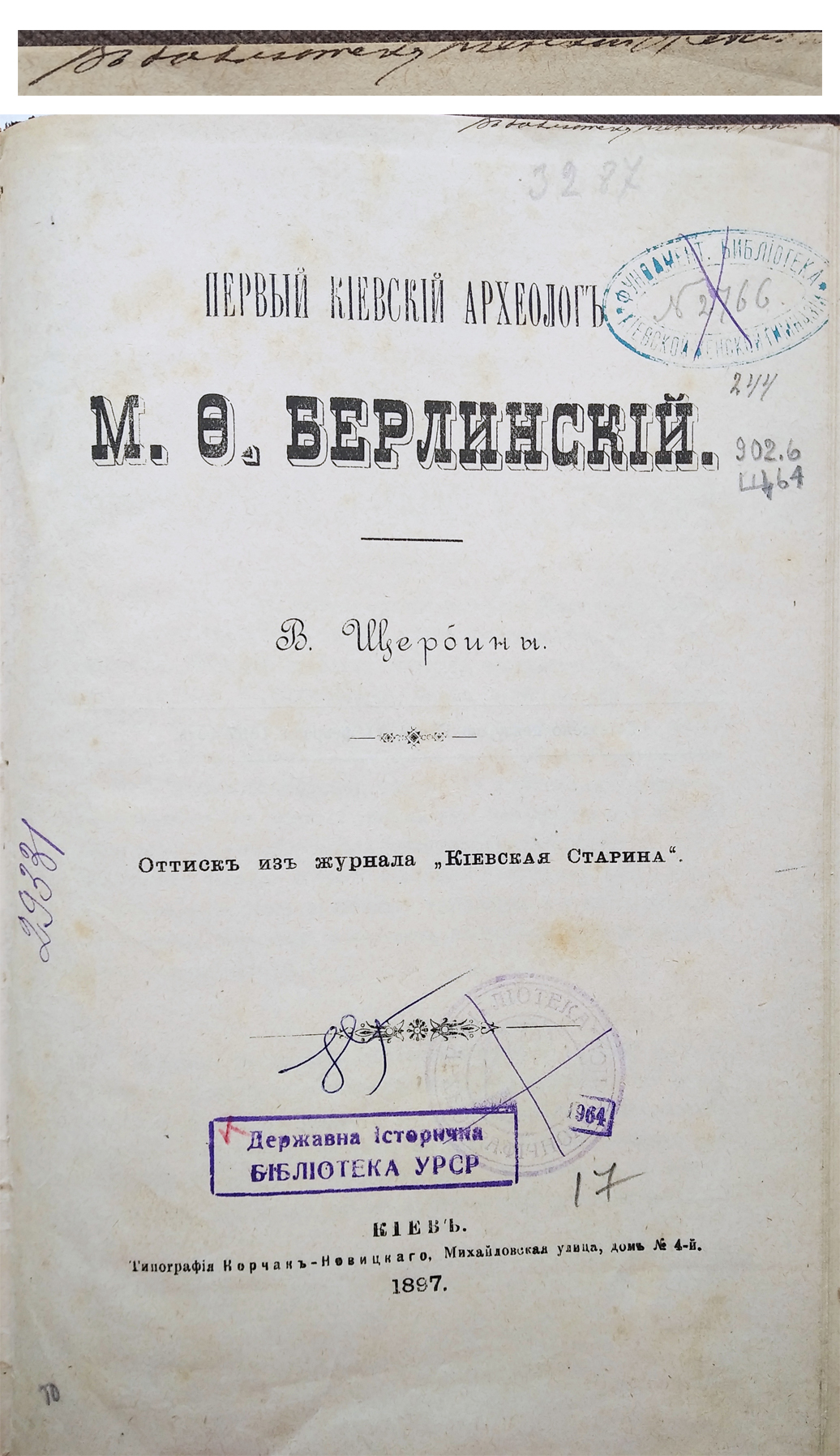8. Щербина В. И. Первый киевский археолог М. Ф. Берлинский / В. И. Щербина. – Киев : Тип. Корчак Новицкого, 1897. – 23 с. – [Відб. з журн. «Киевская старина»]. – Особливості примірника : [Текст автогр.] : «В библіотеку женской [гимназіи]» ; [Шт.] : «Фундамент. библіотека Кіевской женской гимназіи» ; «Бібліотека Археографічної комісії ВУАН».