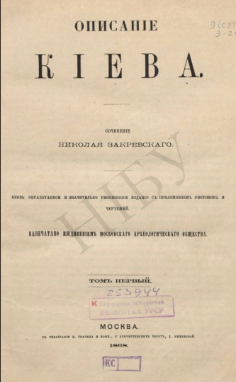 Описание Киева: сочинения: вновь обработанное и значительно умноженное издание с приложением рисунков и чертежей Т. 1. – Т. 2 / Н. Закревский. – Москва : Тип. В. Грачева и Комп., 1868. – 940 с. : ил. – [Друк. екслібрис]: «Изъ библиотеки В. И. Гошкевича»