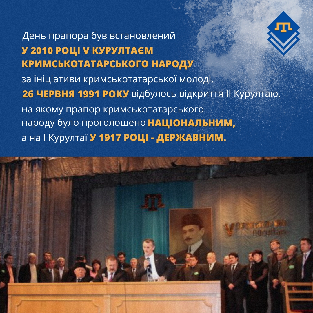 Кримськотатарський прапор – полотнище блакитного кольору із золотистою тамгою – родовим знаком правлячої династії у період державності кримських татар. Був затверджений на 1-му Курултаї (національному з'їзді) кримських татар у 1917 році. День національного прапора кримських татар відзначається 26 червня, у зв'язку з повторним затвердженням його на 2-му Курултаї кримськотатарського народу, що відбувся у червні 1991 року.