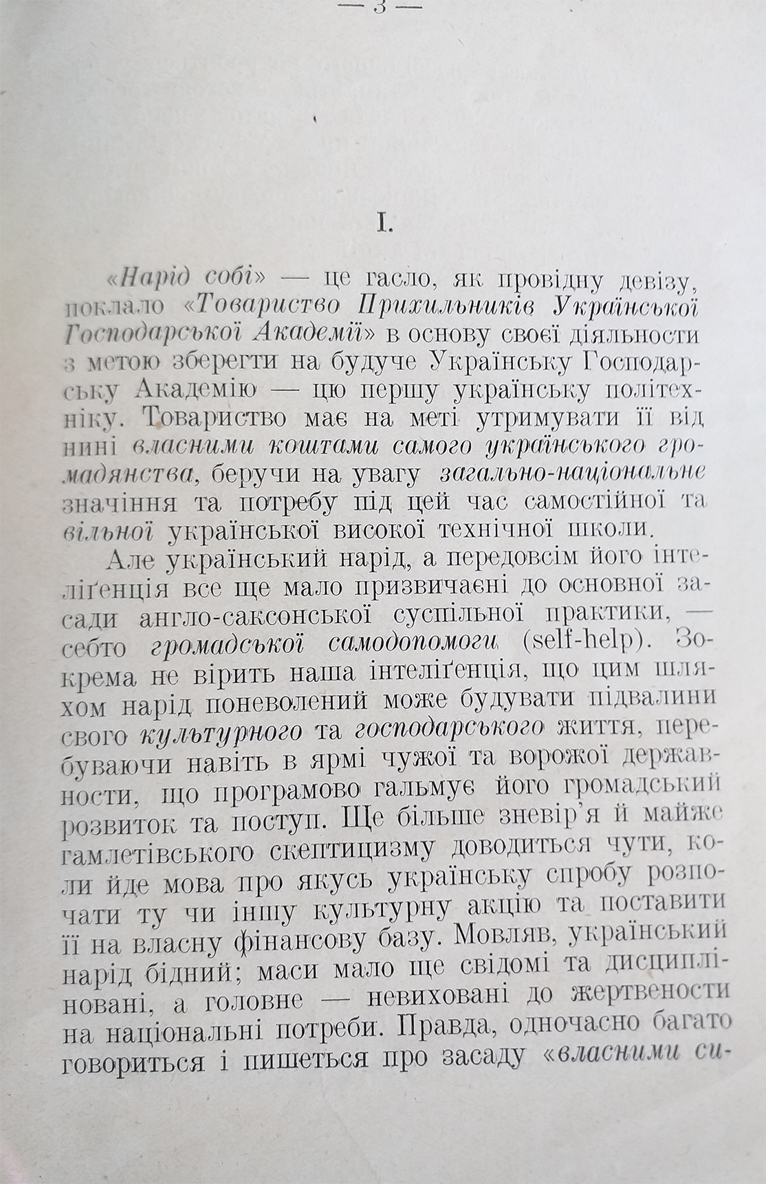 «Нарід собі» – це гасло, як провідну девізу, поклало «Товариство Прихильників Української Господарської Академії» в основу своєї діяльности з метою зберегти на будуче Українську Господарську Академію – цю першу українську політехніку. Товариство має на меті утримувати її віднині власними коштами самого українського громадянства, беручи на увагу загальнонаціональне значіння та потребу під цей час самостійної та вільної української високої технічної школи» – пояснює О. І. Бочковський. Далі автор наводить переконливі докази успішної «громадської самодопомоги (self-help)» різних народів світу. «Зокрема, в історії чеського національного відродження можна знайти чудові зразки та приклади такої національної кооперації. Чехи також найкраще висловили провідну засаду національної самодопомоги. З їхньої історії запозичена як девіза «Товариства Прихильників УГА», так і заголовок цієї брошури», – зазначає автор.