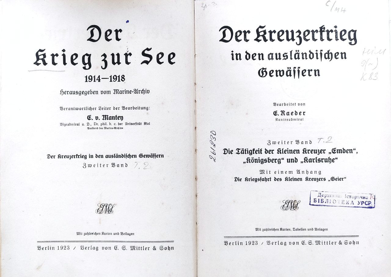 Der Krieg zur See. 1914-1918. Herausgegeben vom Marine-Archiv. - Der Kreuzerkrieg in den ausländischens Gewassern [Текст]. Т. 2. Bearbeitet von E. Raeder. - Berlin : [s. n.], 1923. - XVI, 374 s.