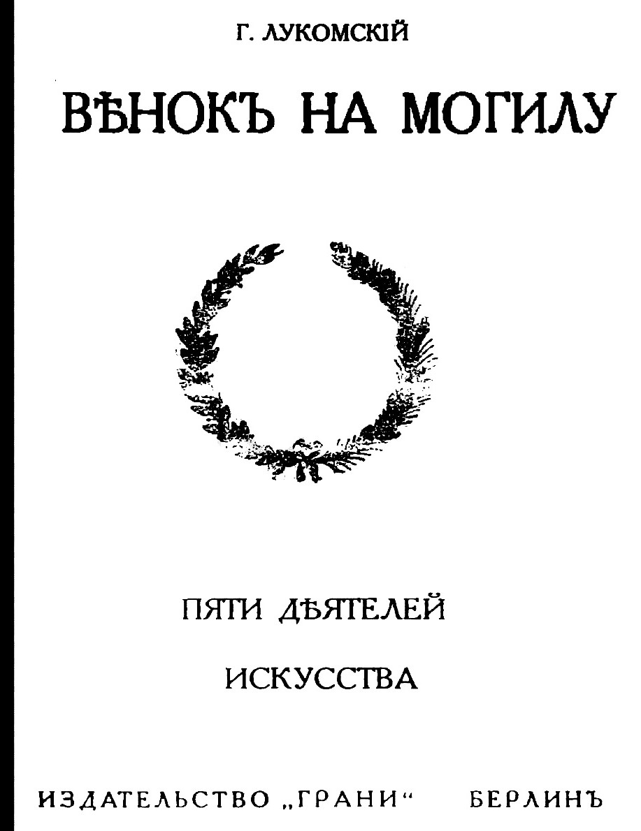 Лукомский, Георгий. Венок на могилу пяти деятелей искусства : памяти Е. И. Нарбута, В. Л. Модзалевского, А. А. Мурашко, К. В. Шероцкого, П. Я. Дорошенко / Г. К. Лукомский. – Берлин : Грани, 1925. – 30 с.