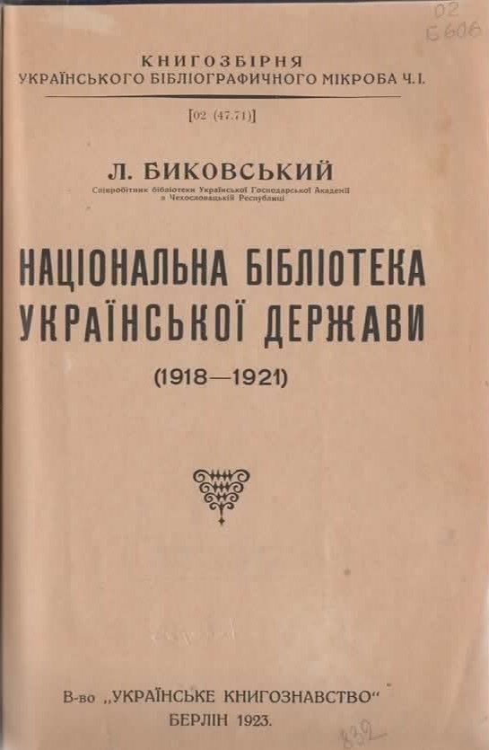 11. Биковський Л. Національна бібліотека української держави (1918–1921) / Л. Биковський. – Берлін : Вид-во українське книгознавство, 1923. – 38 с. – (Книгозбірня українського бібліографічного мікроба ; Ч. 1). Шифр: 02/Б606