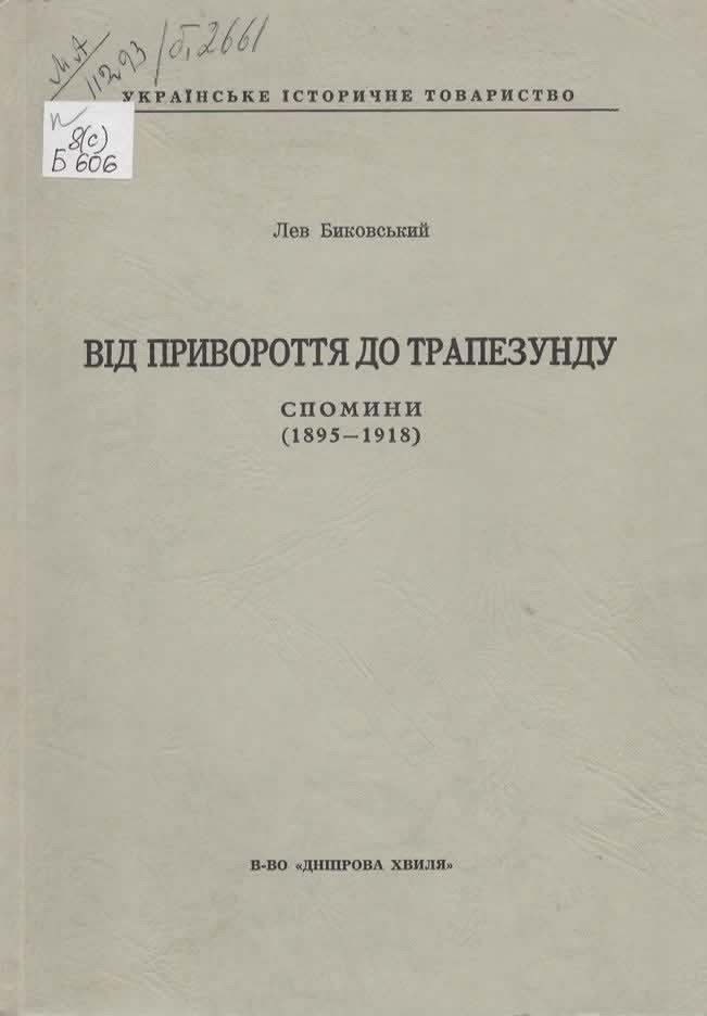 3. Биковський Л. Ю. Від Привороття до Трапезунду : спомини (1895–1918) / Л. Ю. Биковський. – Мюнхен ; Денвер : Дніпрова хвиля, 1969. – 133, [2] с. – (Українське іст. т-во). Шифр: 8(с)/Б606