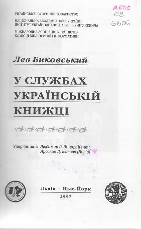 13. Биковський Л. У службах українській книжці : (Автобіобібліогр. Л. Биковського) / Л. Биковський ; упоряд.: Л. Р. Винар, Я. Д. Ісаєвич ; НАН України. – Львів ; Нью-Йорк, 1997. – 327 с. : іл. Шифр: А5710/02/Б606