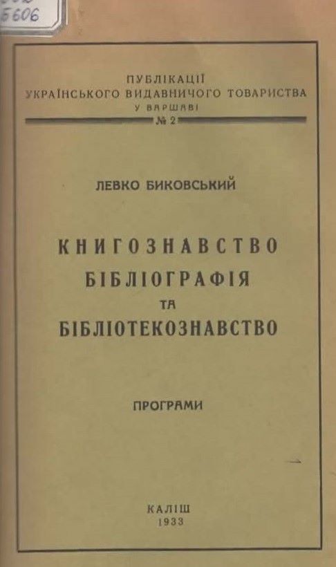 9. Биковський Л. Книгознавство. Бібліографія та бібліотекознавство : Програми / Л. Биковський.– Каліш, 1933. – 32 с. – (Публікації українського видавничого т-ва у Варшаві ; № 2). Шифр: 002/Б606