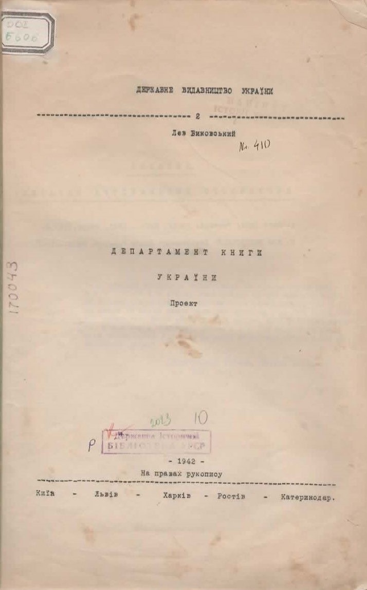 5. Биковський Л. Департамент книги України : проєкт / Л. Биковський. – Київ : Держвидав України, 1942. – 26 с. Шифр: 002/Б606
