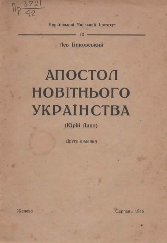 1. Биковський Л. Апостол новітнього українства (Юрій Липа) / Л. Биковський; Український морський ін-т. – 2-ге вид. – Женева, 1946. – 8 с. Шифр: Пр 3721/42