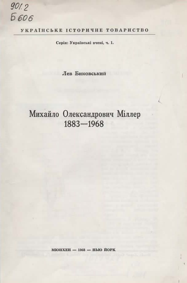 10. Биковський Л. Михайло Олександрович Міллер 1883-1968 / Л. Биковський. – Мюнхен, 1968. – 118 с. : іл. – (Українські вчені ; Ч. 1). – Відбитка з журн. «Український історик». Ч. 1–4. 1968 р. Шифр: 901.2/Б606