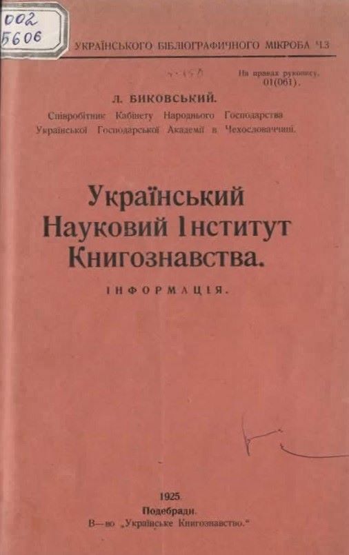 16. Биковський Л. Ю. Український науковий інститут книгознавства : інформація / Л. Ю. Биковський. – Подєбради : Вид-во Укр. книгознавство, 1925. – 47 с. – (Книгозбірня українського бібліографічного мікроба ; Ч. 3). – На правах рукопису. Шифр: 002/Б606