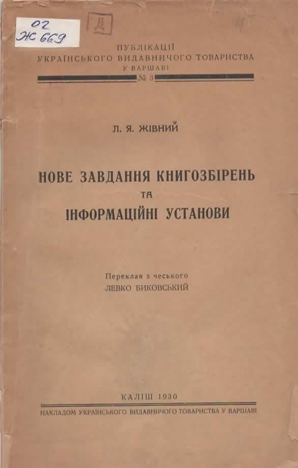 17. Жівний, Л. Я. Нове завдання книгозбірень та інформаційні установи : пер. з чеськ. / Л. Я. Жівний ; пер. Л. Ю. Биковський. – Каліш : Укр. вид. т-во у Варшаві, 1930. – 46 с. – (Публікації українського видавничого т-ва у Варшаві ; № 3). Шифр: 02/Ж669