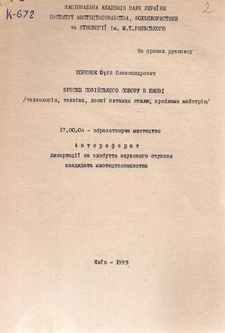 Коренюк, Ю. О. Фрески Софійського Собору в Києві (технологія, техніка, деякі питання стилю, проблема майстрів) : автореферат дис. ... канд. мистецтвознавства / Ю. О. Коренюк. – Київ, 1995. – С. 15 – 17.