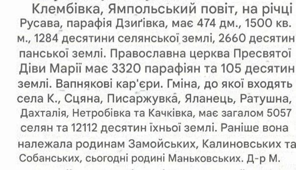Історична довідка. Село Клембівка (Клембовка) Ямпільського району Вінницької області розташоване в лісостеповій полосі правобережної частини українського Поділля по обидва береги річки Русави (притока Дністра) у 20 км від райцентру м. Ямпіль і за 35 км від залізничної станції Вапнярка.