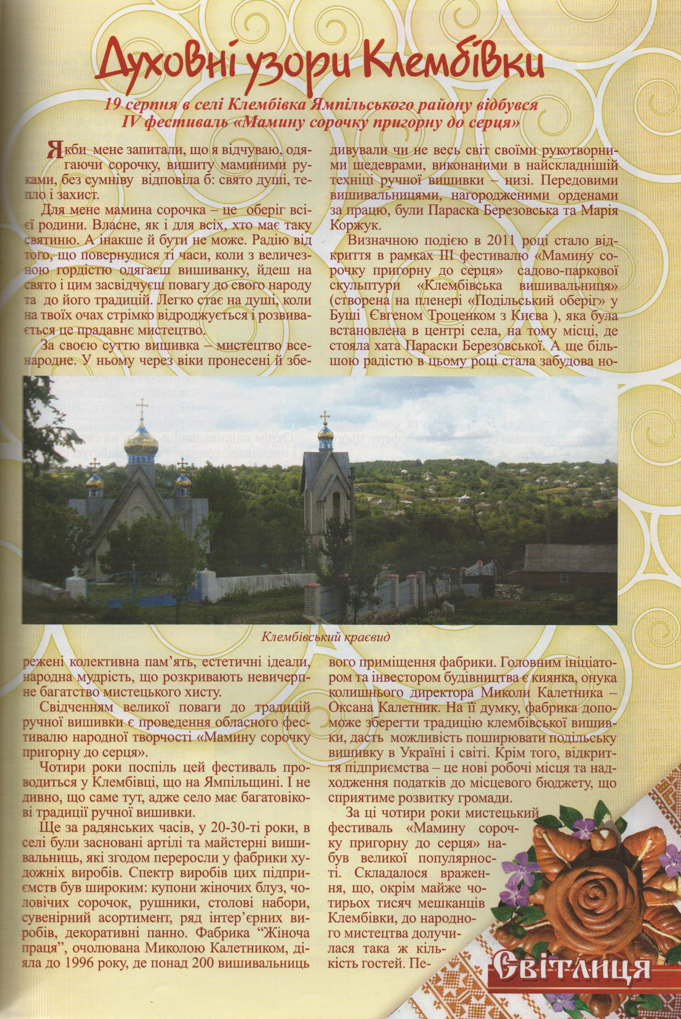 відроджуються і розвиваються духовно-мистецькі традиції клембівської вишивки. З 2009 р. у селі Клембівка проводять обласний фестиваль «Мамину сорочку пригорну до серця»; відкрили Ц