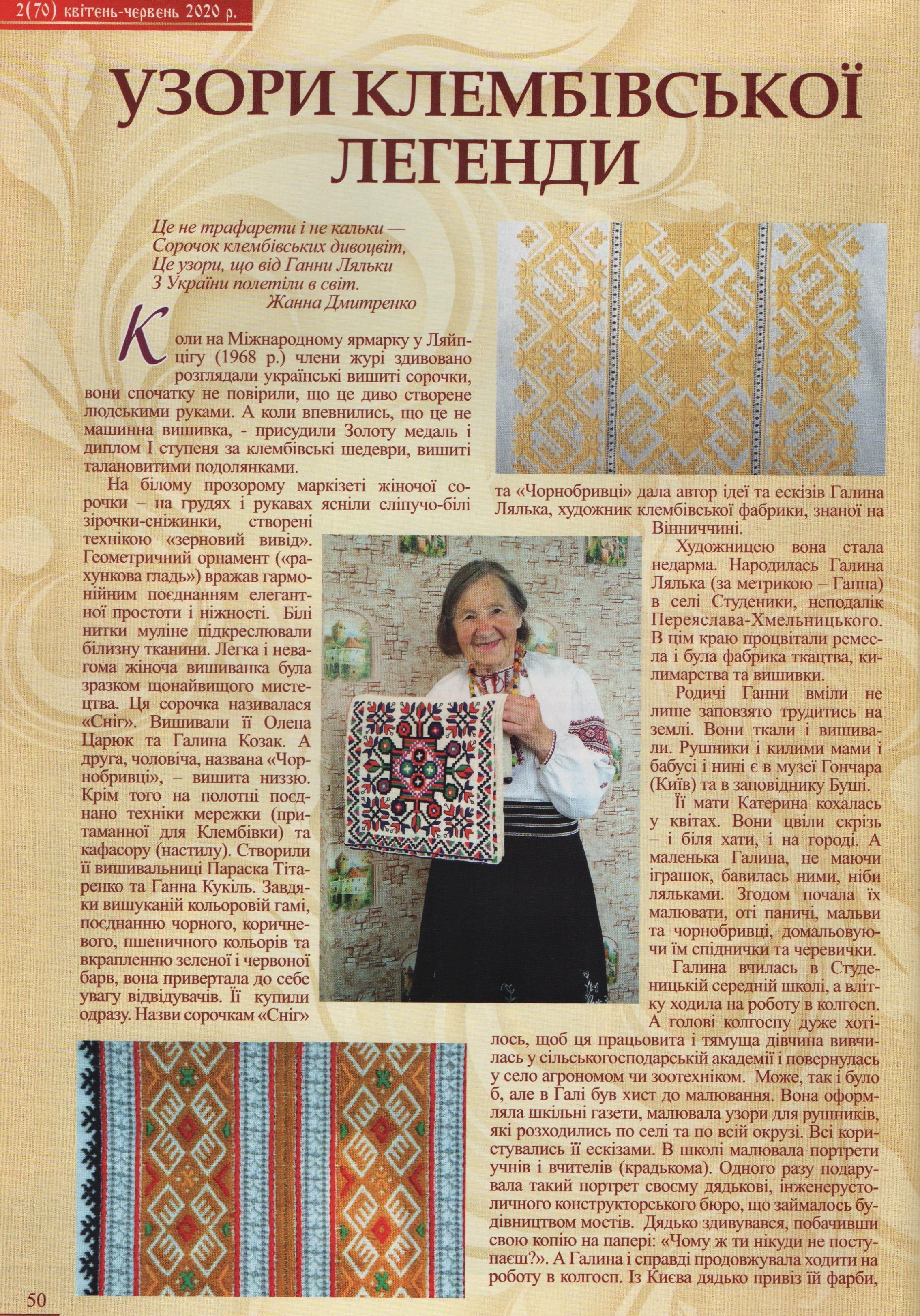 Із багатьох джерел дізнались про історію артілі «Наша польза» у селі Клембівка, яка була організована на початку ХХ століття, у якій працювали місцеві майстрині та вишивальниці із сусідніх сіл, пізніше перейменовану в артіль «Жіноча праця», у 1960 р. її реорганізовано у фабрику, що з 1974 р. увійшла до складу Вінницького виробничо-художнього об’єднання «Вінничанка». Серед кращих майстрів – П. Березовська, Д. Волошина, М. Калетник, К. Шинкар, Г. Козак, Килина та Марія Коржуки, П. Кубряк, Г. Кукіль, Г. Лялька, О. Мельник, Т. Милимко, О. Мундир, П. Титаренко, О. Царюк, Г. Бальва та ін. Багато майстринь удостоєні звання «Майстра народної творчості». Їх твори зберігаються в Музеї українського народного декоративного мистецтва у Києві, Вінницькому краєзнавчому музеї тощо. У 1968 р. на Лейпцигському ярмарку клембівські вишивки були удостоєні золотої медалі. На фабриці створювали вироби здебільшого на замовлення – за малюнками і зразками, які розробляли на фабриці чи надсилали для замовлень, але витончену майстерність клембівчанки не втратили. Вироби виробничо-худож