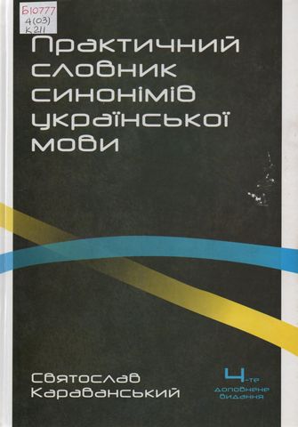 - Караванський С. Практичний словник синонімів української мови: близько 20 000 синонімічних рядів / С. Караванський. – 4-е вид., опрацьоване і значно допов. – Львів : БаК, 2012. – XII, 523 с. Шифр: Б10777/4(03)К211