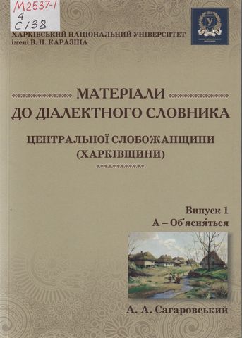 - Сагаровський А. А. Матеріали до Діалектного словника Центральної Слобожанщини (Харківщини). Вип. 1 : А – Об’ясняться / А. А. Сагаровський ; М-во освіти і науки, молоді та спорту України, Харківський нац. ун-т ім. В. Н. Каразіна. – Харків: ОВВ НМЦ ХНУ імені В. Н. Каразіна, 2011. – 294 с. Шифр: М2537-1/4/С138