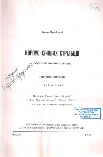 Кучабський, В. Корпус Січових Стрільців : воєнно-історичний нарис : 1917–1967 : на основі Книги “Золоті ворота” В-ва “Червона Калина” у Львові (1937) з доповненням новими матеріялами / В. Кучабський. – Ювілейне вид. – Чікаго, 1969. – XVI, 663 с. : карт., іл., фот.