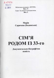 - Саричева М. М. Сім’я родом із 33-го: документально-біографічна повість / М. М. Саричева ; авт. проєкту, упоряд. І. Забіяка, ред. В. В. Каленіченко. – Київ, 2023.– 87 с.: фот. – (Б‑ка альманаху “Вітряк” ; Вип. 27). Шифр:А47976/9(с2)/C201