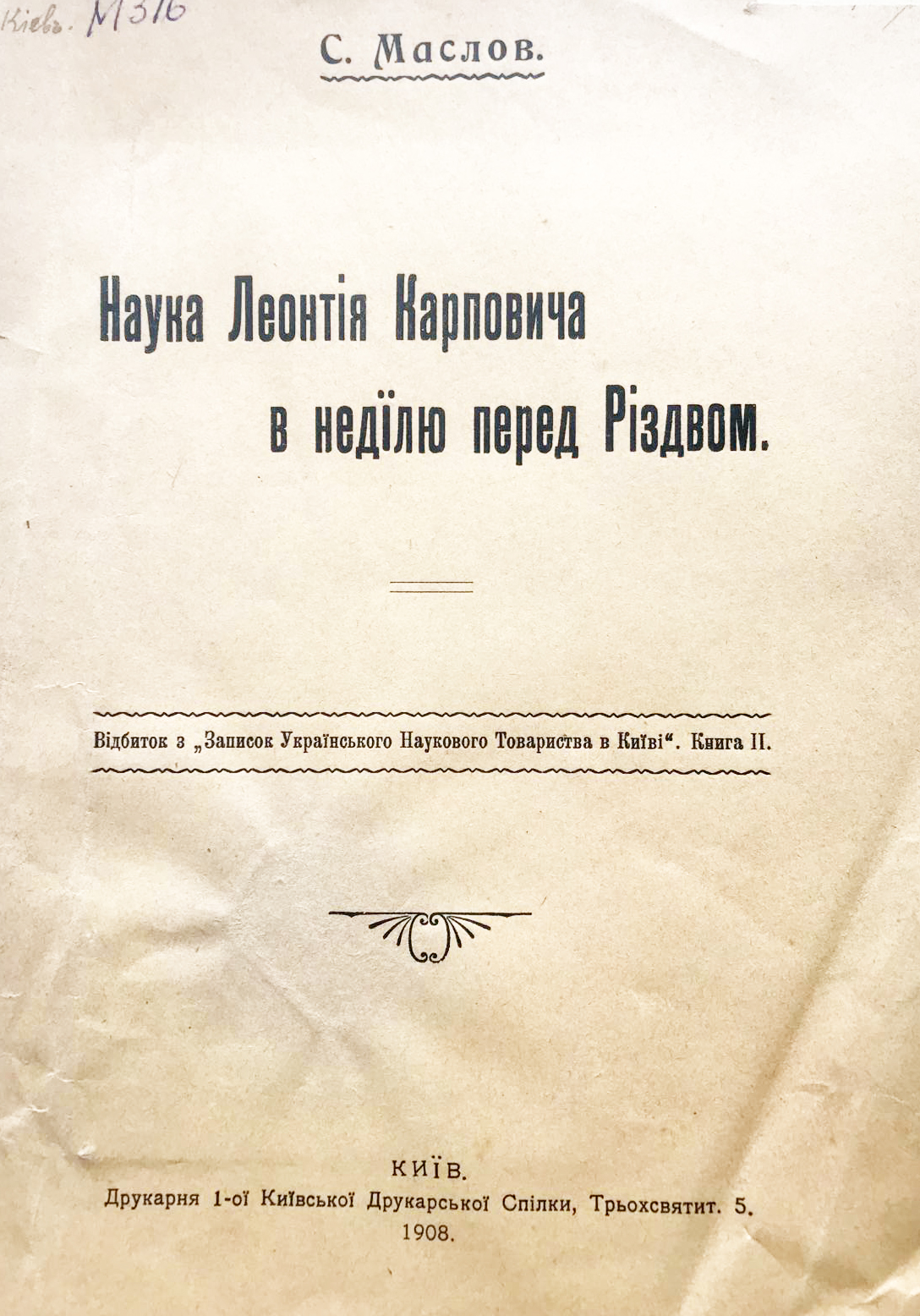 Маслов С. Наука Леонтія Карповича в неділю перед Різдвом / написав С. Маслов // Записки Українського наукового товариства у Київі. Кн. 2. – Київ, 1908. – С. 117-141 [IV].