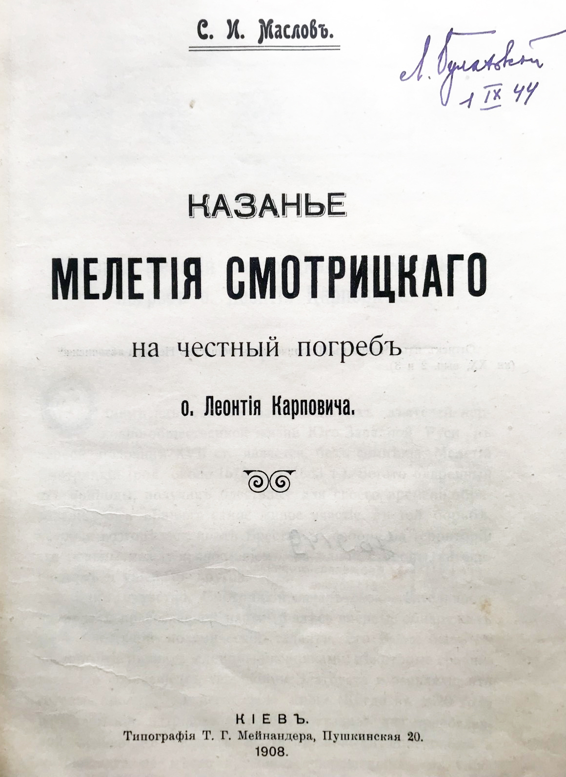 Маслов С. И. Казанье Мелетия Смотрицкого на честный погреб о. Леонтия Карповича / С. И. Маслов. – Киев : Тип. Т. Г. Мейнандера, 1908. – 55, [6] с. – Оттиск из «Чтений в Историческом Обществе Нестора-летописца (кн. 20; вып. 2 и 3). – На титульному аркуші – власницький запис, текст: «Л. Булаховський. 1 IX 44». Леонід Арсенійович Булаховський (1888-1961) - видатний український мовознавець, академік АН УРСР (з 1939), член-кореспондент АН СРСР (з 1946), заслужений діяч науки УРСР (1941).