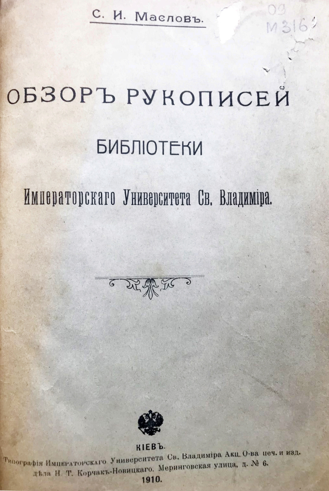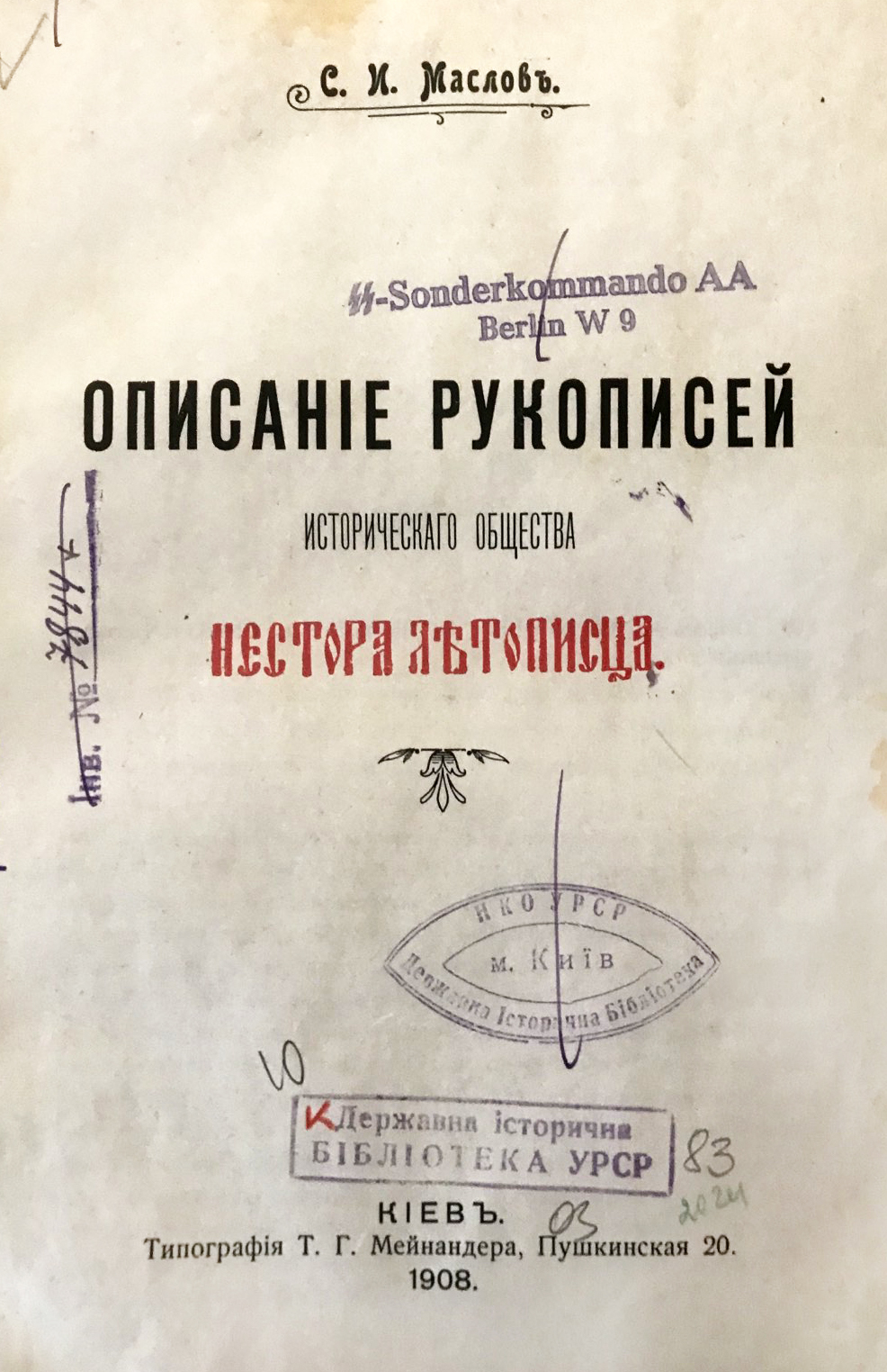 Маслов С. И. Описание рукописей Исторического Общества Нестора-летописца. – Киев : Тип. Т. Г. Мейнандера, 1908. – VII, [1], 50, [2], IV, 58 с. – Оттиск изXXI кн. «Чтений в Историческом Обществе Нестора-летописца». – На обкладинці – дарчий запис, текст: «Многоуважаемому Юлиану Андреевичу Кулаковскому. Серг. Маслов». Юліан Андрійович Кулаковський (1855-1919) - історик, археолог, філолог класичних мов, візантиніст.