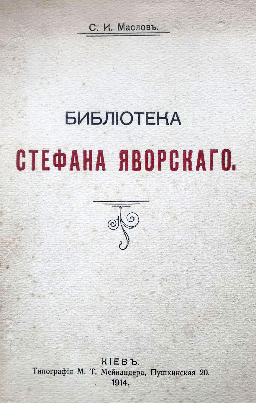 Маслов С. Библиотека Стефана Яворского. – Киев : Тип.Т. Г. Мейнандера, 1914. – [2], 66, LXXXVIIIс. : [4] вкл. л. : ил. – Оттиск из Чтений в Историческом Обществе Нестора-летописца. Кн. 24. Вып. 2).