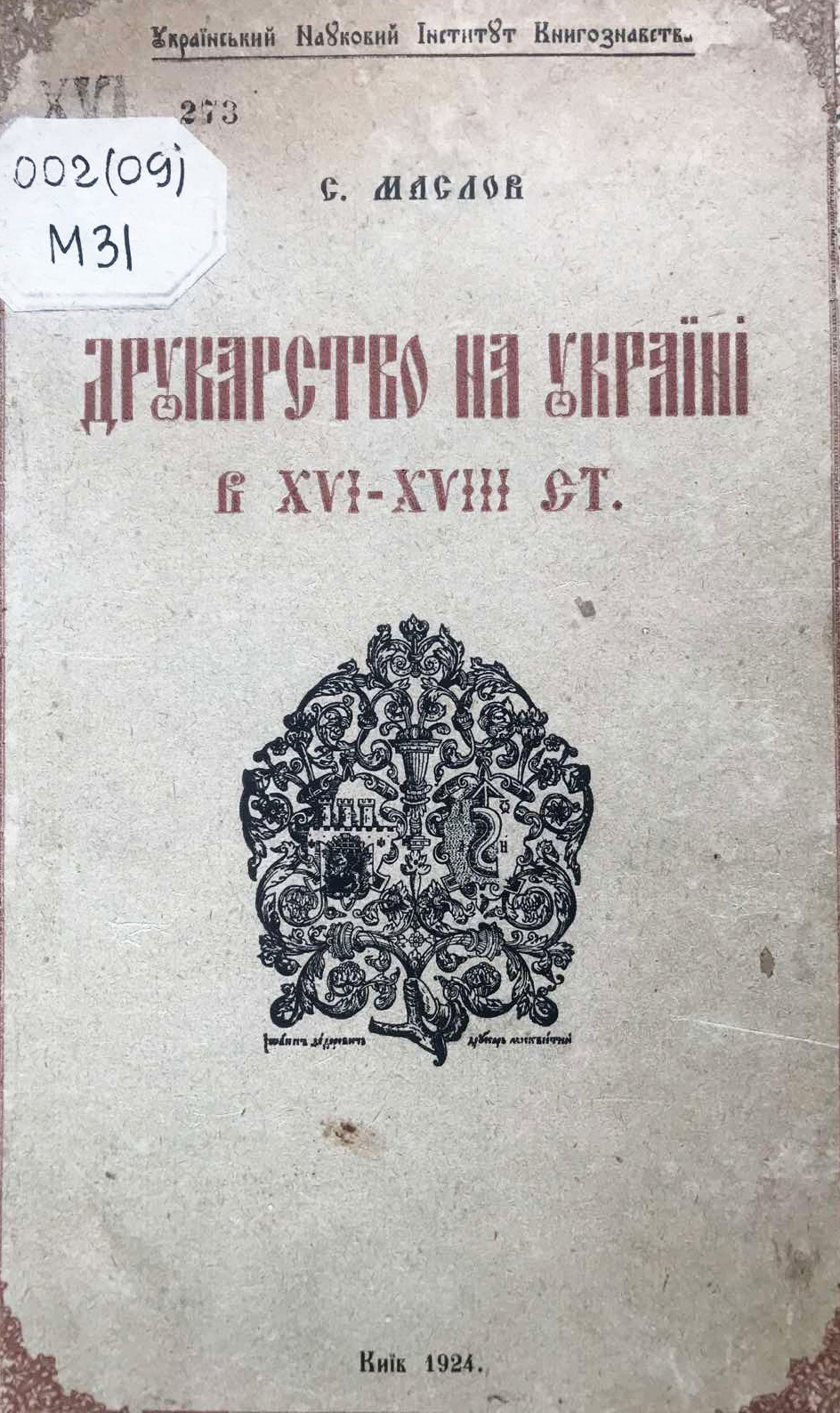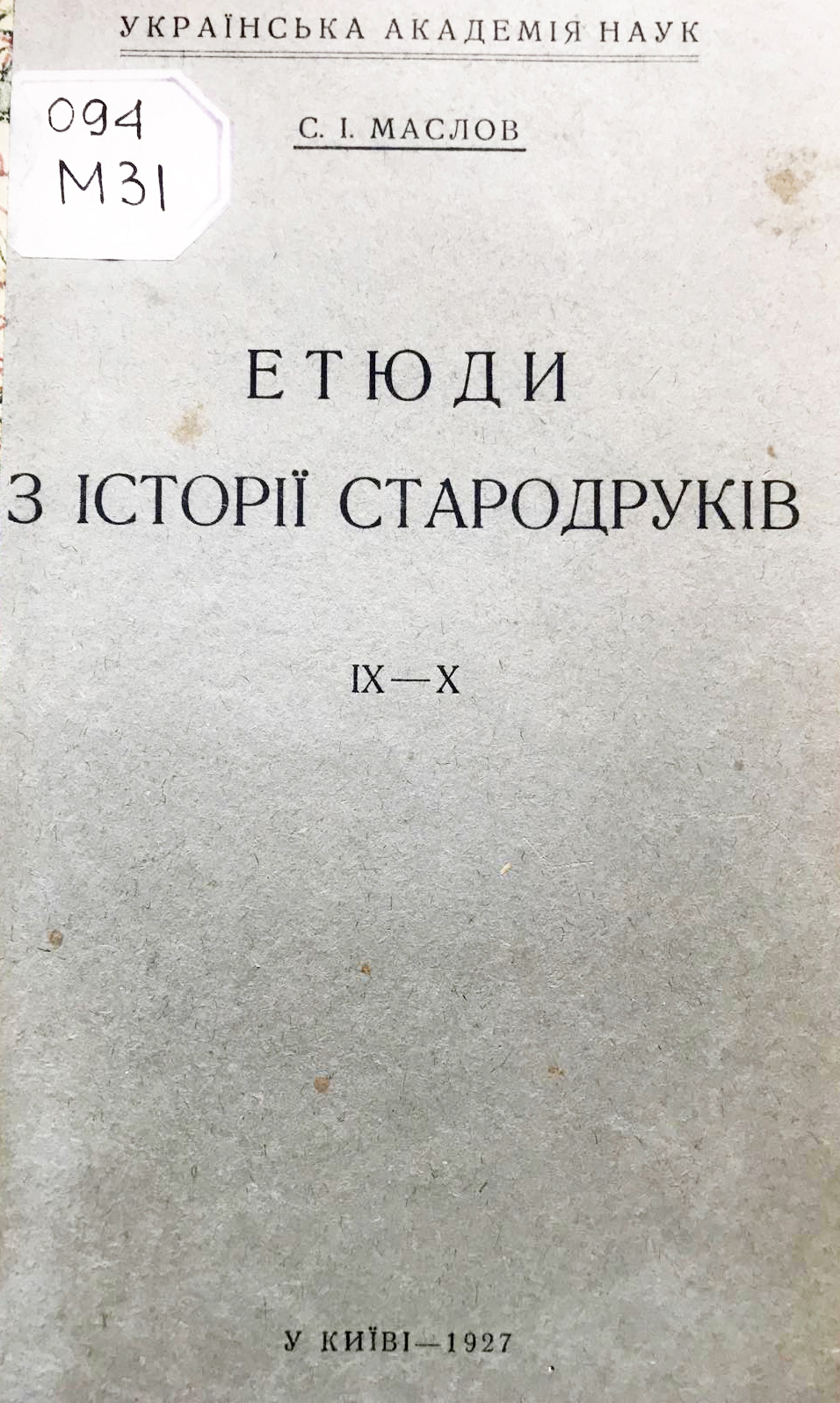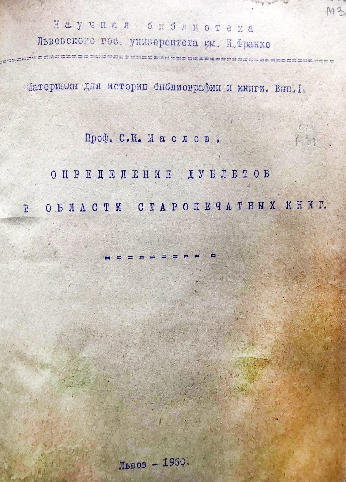 Маслов С. І. Визначення дублетів в ділянці стародруків. – Київ, 1936. – 13 с. / С. І. Маслов ; Бібліотека Академії наук УСРР. – (Матеріали до історії книги і письма).