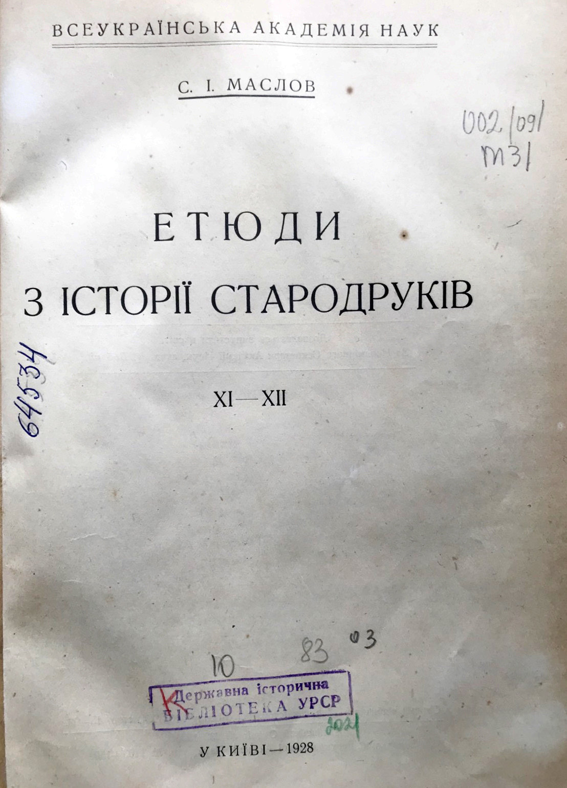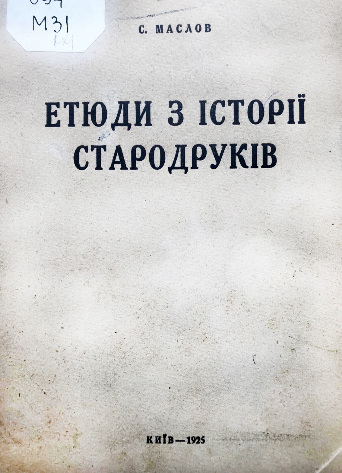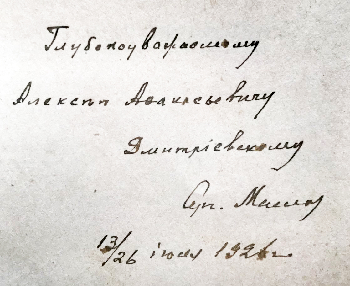 Маслов С. Етюди з історії стародруків I-VIII / С. Маслов ; Український науковий інститут книгознавства. – Київ, 1925. – 79, [5] с. – Відбитка з «Трудів Українського Наукового Інституту Книгознавства ; т. 1». – На авантитулі дарчий запис, текст: «Глубокоуважаемому Алексею Афанасьевичу Дмитриевскому. Серг. Маслов. 13/26 июля 1926 г.». Олексій Опанасович Дмитрієвський (1856-1929) - історик-літургіст, знавець грецької палеографії та книгарства.