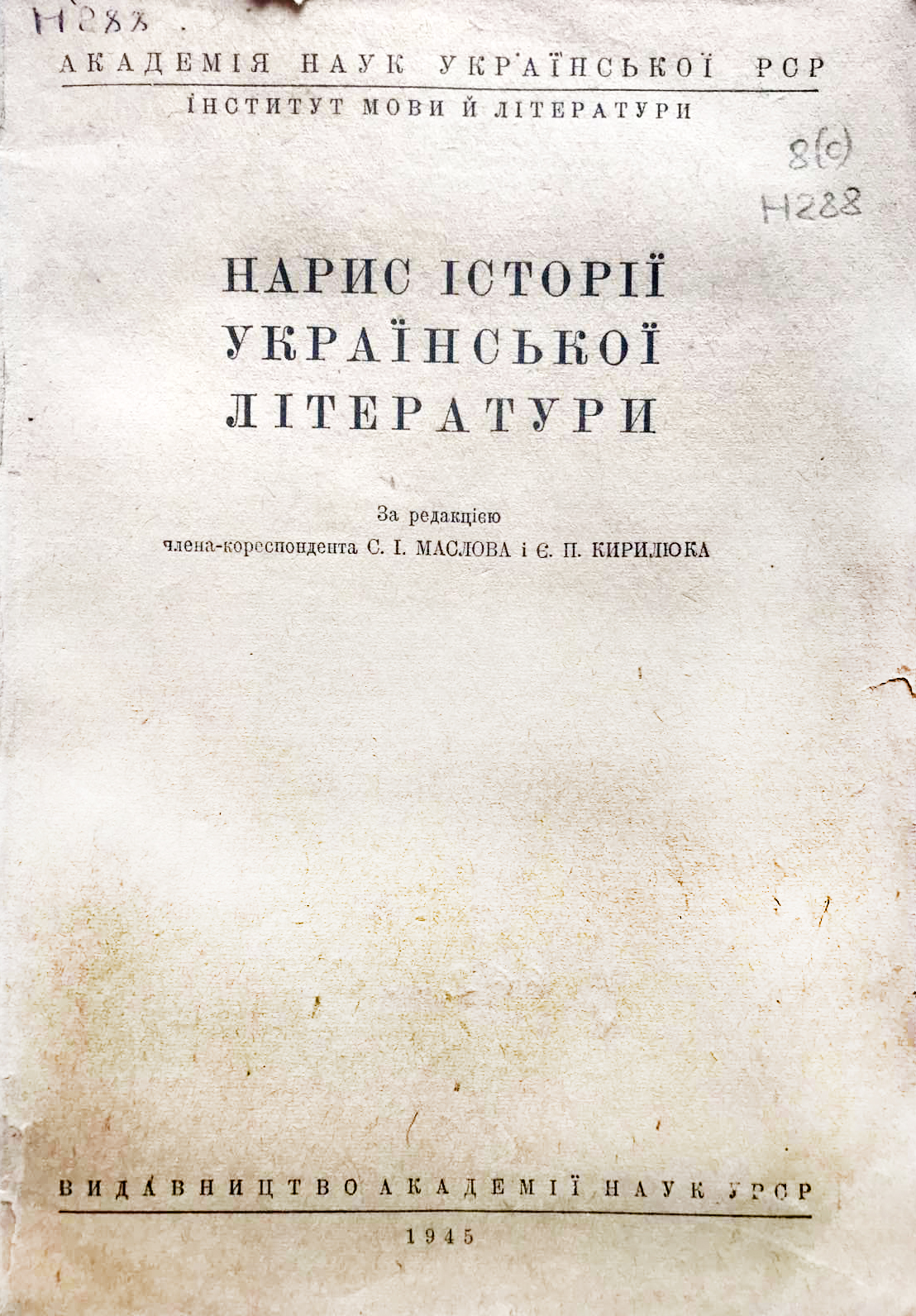 Нарис історії української літератури / АН УРСР, Ін-т мови і літератури ; за ред. С. І. Маслова і Є. П. Кирилюка. – Москва : Вид-во АН УРСР, 1945. – 279 с.