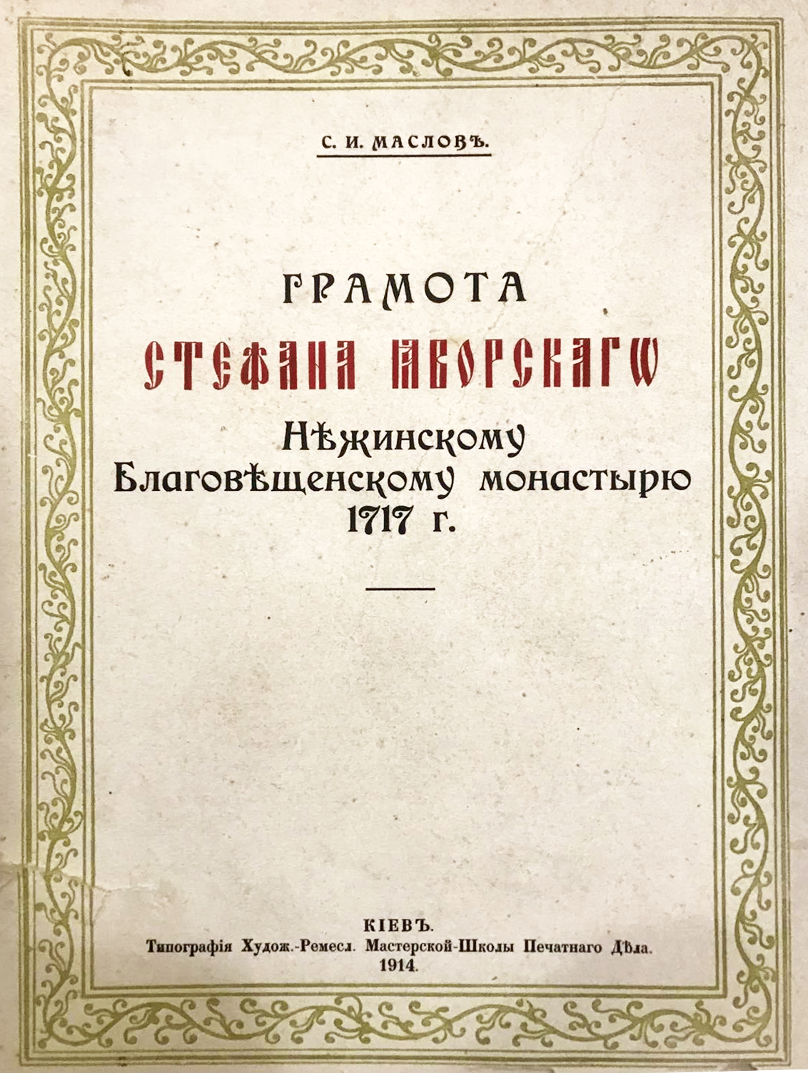 Маслов С. И. Грамота Стефана Яворского Нежинскому Благовещенскому монастырю 1717 г. – Киев : Тип. Худож.-ремесл. мастерской – Школы Печатного дела, 1914. – 16 с., 2 вкл. л. : ил. – Отдельный оттиск из журнала «Искусство в Южной России», 1914; №5-6. – На титульному аркуші – власницький запис, текст: «АНазарев[ский] 1914». Олександр Адріанович Назаревський (1887-1977) - видатний український літературознавець, бібліограф, педагог, учасник Семінарія Володимира Перетца в Університеті св. Володимира, товариш С. І. Маслова.