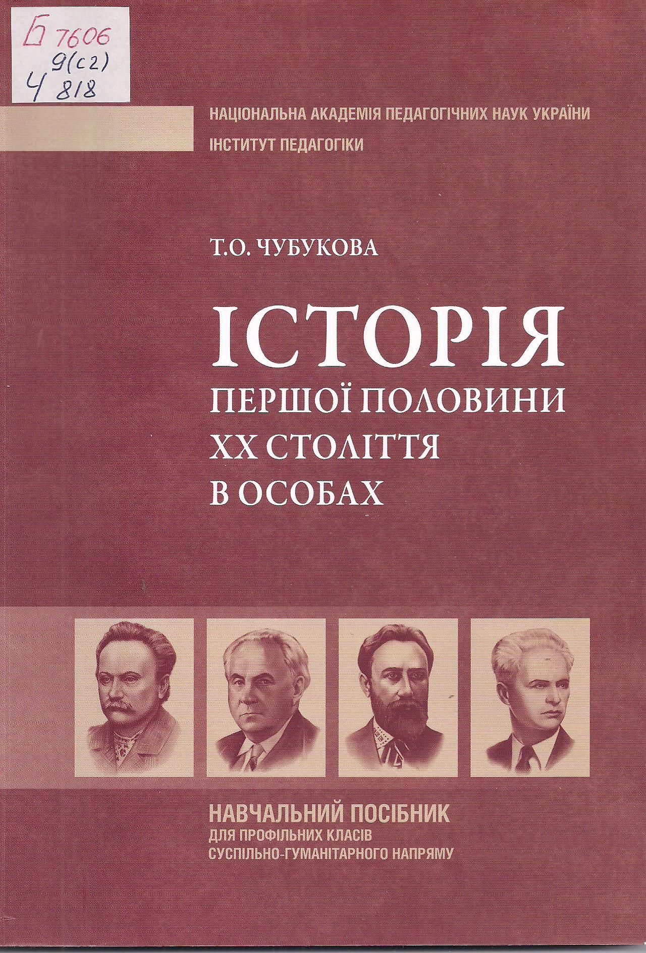 Б7606 / 9(с2) Ч-818 Чубукова Т.О. Історія першої половини XX століття в особах : навчальний посібник для профільних класів суспільно-гуманітарного напряму / Т. О. Чубукова ; НАПН України, Інститут педагогіки. – Київ : Педагогічна думка, 2012. – 128 с. Зміст навчального посібника «Історія першої половини ХХ століття в особах» висвітлює історію людства, окремих народів через долю пересічної людини та видатної постаті, тому що людина є творцем, суб’єктом і відповідно основною діючою особою в історії. В посібнику розкрито сутність і значення гуманістичних цінностей та традицій українського народу, подано гуманітарно-історичну картину світу за допомогою різноманітних образів і картин з життя людей минулого. Головна мета: показати роль особистості в історії; сформувати в учнів більш повну і яскраву картину нашої держави та міста; виховувати в учнів почуття патріотизму, почуття гордості за свою Батьківщину та її громадян. |