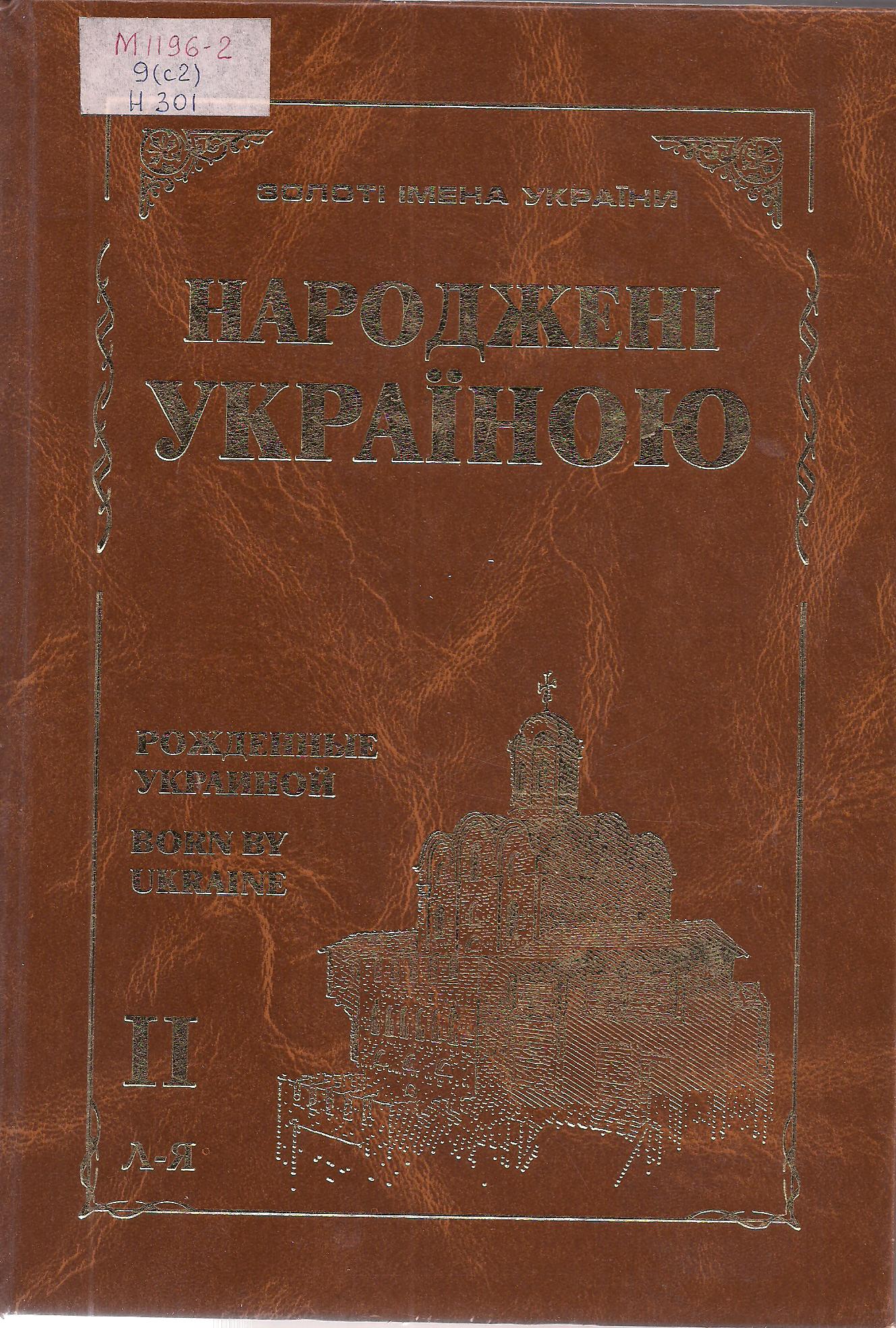М1196-2 / 9(с2) Н301 Народжені Україною : меморіальний альманах : у 2 т. Т. 2. Л—Я / ред. О. Онопрієнко. – Київ : Євроімідж, 2002. – 896 с. : фото. – С. 512-513. Меморіальний альманах «Народжені Україною» є продовженням серії видань «Золоті імена України». До книги увійшло близько тисячі персоналій про наших видатних співвітчизників різних національностей – державних, громадських і релігійних діячів, просвітників і науковців, діячів культури, мистецтва і спорту, які походженням, народженням або діяльністю пов’язані з Україною і стали славою та гордістю її народу. |