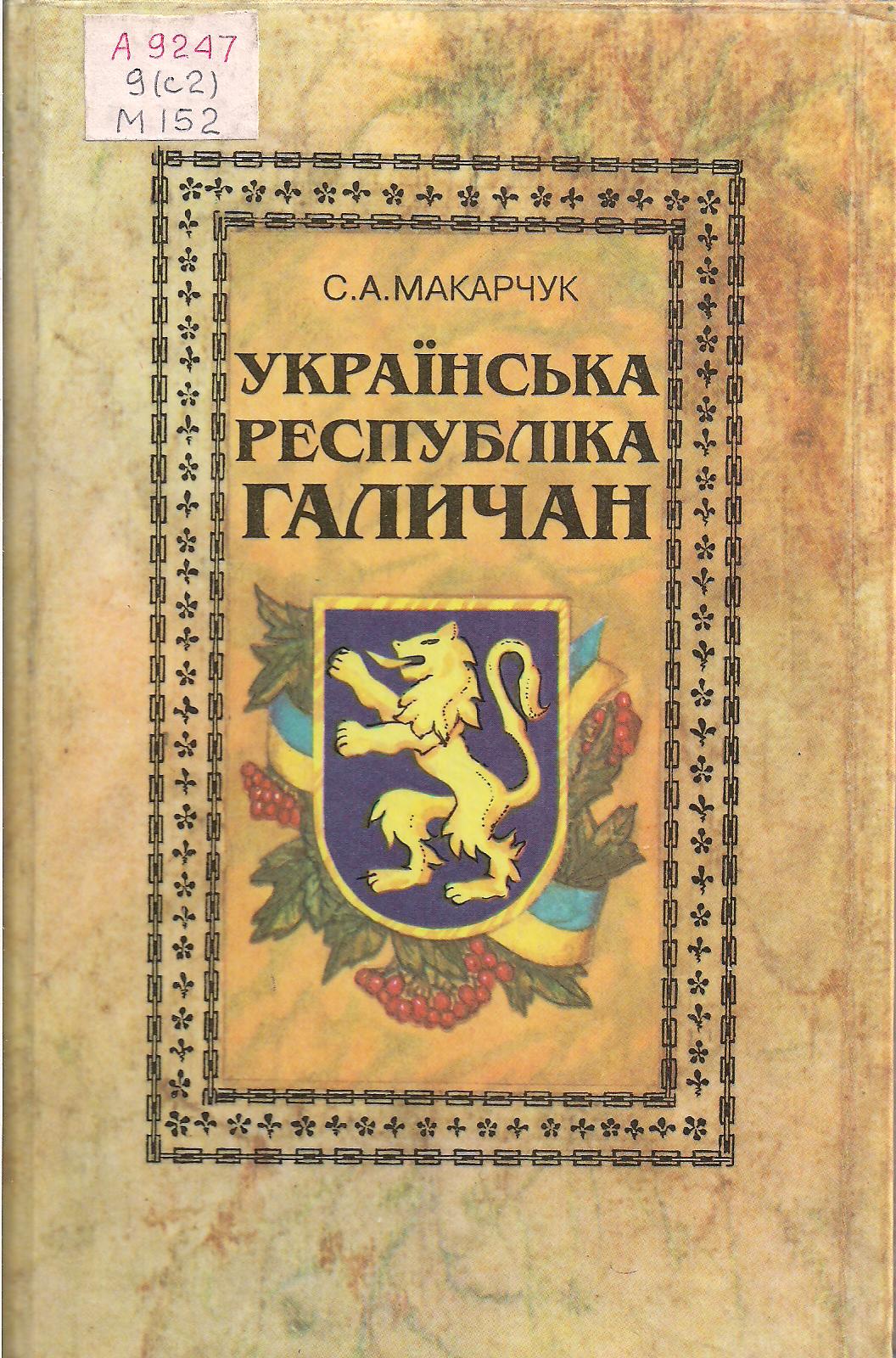 А9247 / 9(с2) М152 Макарчук С.А. Українська Республіка галичан: нариси про ЗУНР / С. А. Макарчук. – Львів : Світ, 1997. – 192 с. – С. 42. Пропонований посібник висвітлює історію українського національно-визвольного руху в Австро-Угорщині, що привів до створення у жовтні 1918 р. Української Національної Ради та проголошення Західноукраїнської Народної Республіки. Розглядаються питання державного і військового будівництва в ЗУНР, хід українсько-польської війни 1918-1919 рр., причини поразки Української Галицької Армії. Велика увага звернена на ідею соборності в політичній діяльності ЗУНР, що втілилася у пам’ятному історичному Акті Злуки. |