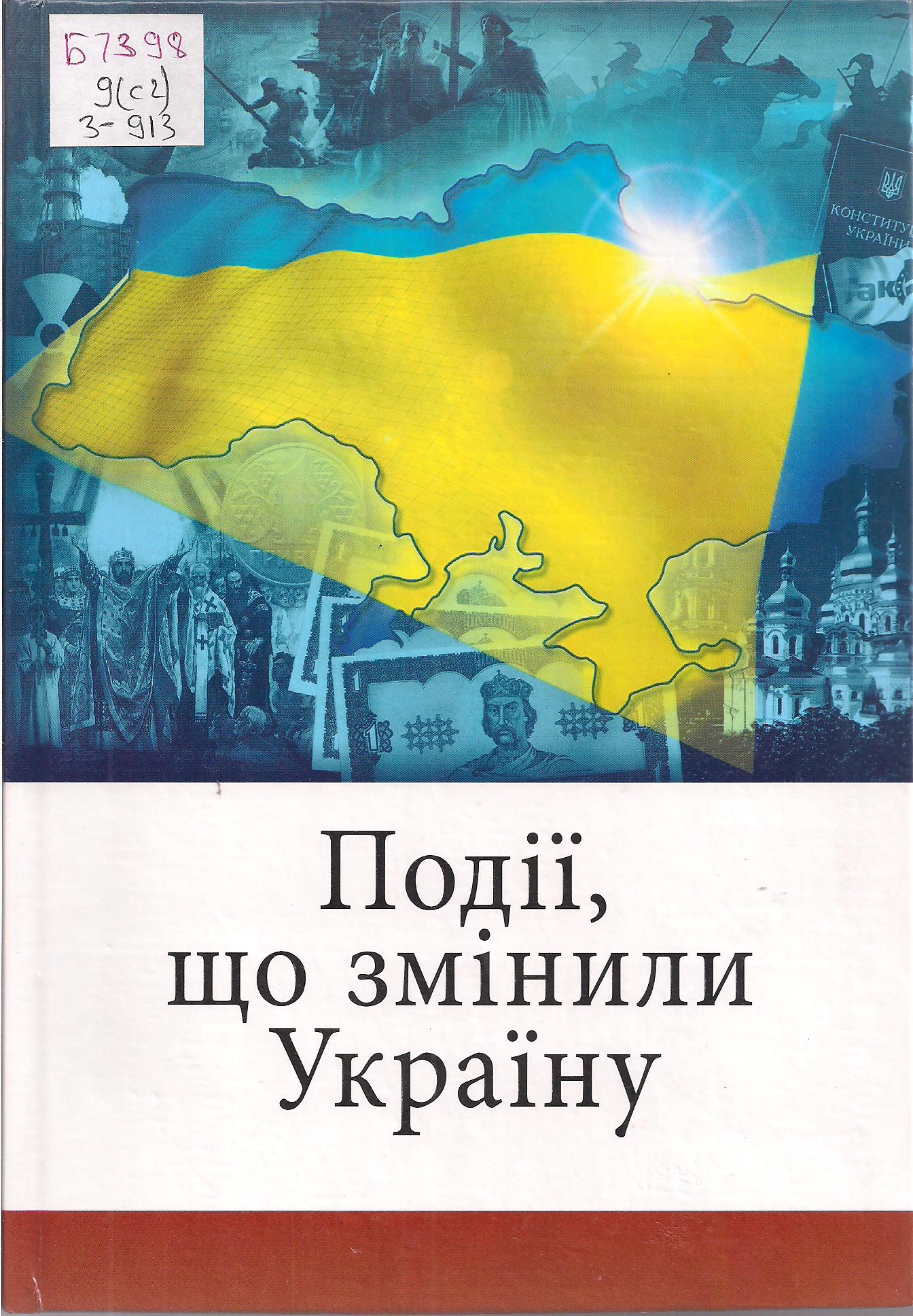 Б7398 / 9(с2) З-913 Зубков С.К. Події, що змінили Україну / С. К. Зубков, В. Л. Карнацевич, А. Ю. Хорошевський. – Харків : Факт, 2013. – 384 с. – С. 250-253. До цієї книжки ввійшли нариси про події, що змінили історію України. Виникнення Трипільської культури, Заснування Києва та Львова, зародження Запорізької Січі, Переяславська Рада, Полтавська битва, публікація «Енеїди» Котляревського, створення державного гімну України, бій під Крутами, Голодомор, аварія на Чорнобильській АЕС, введення в обіг гривні – це лише мала частка тем, що представлені у цьому виданні. |