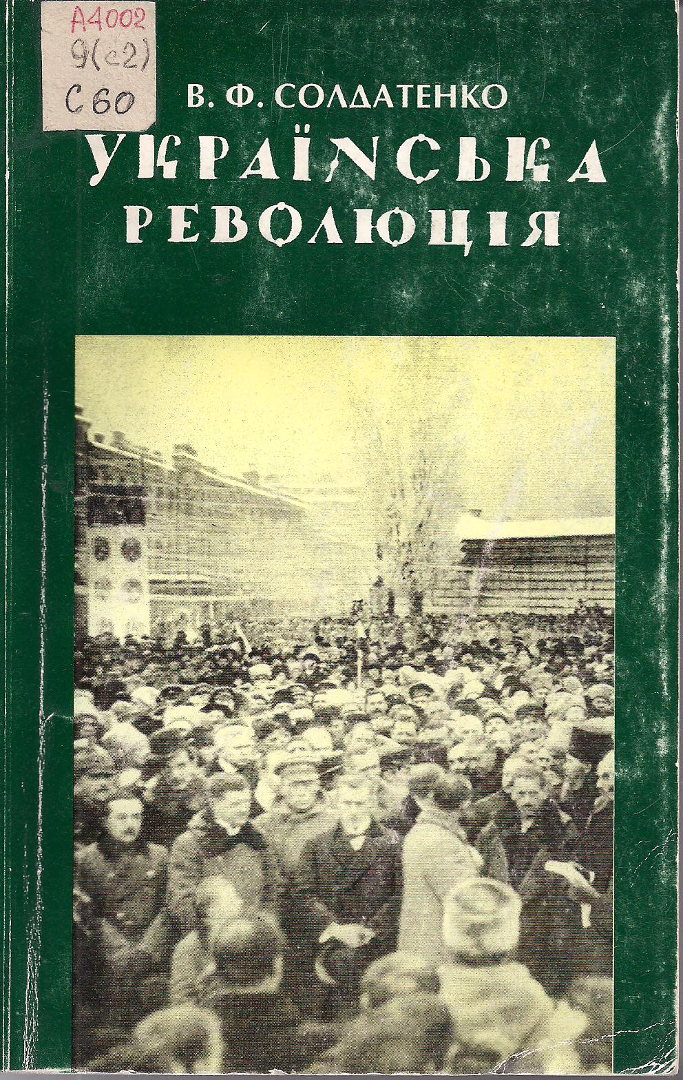А4002 / 9(с2) С60 Солдатенко В.Ф. Українська революція: концепція та історіографія (1918-1920 рр.) / В. Ф. Солдатенко ; Інститут політичних і етнонаціональних досліджень, НАН України. – Київ : [б. в.], 1999. – 512 с. – С. 325-361. Монографія є другою книгою автора про малодосліджений суспільний феномен-Українську революцію. На основі праць ідеологів тогочасного визвольного руху, документів політичних партій і організацій, матеріалів періодичної преси вперше в історіографії здійснюється спроба комплексного аналізу розвитку концепції Української революції, врахування в ній зміни конкретно-історичних умов і завдань боротьби в 1918-1920 рр. |