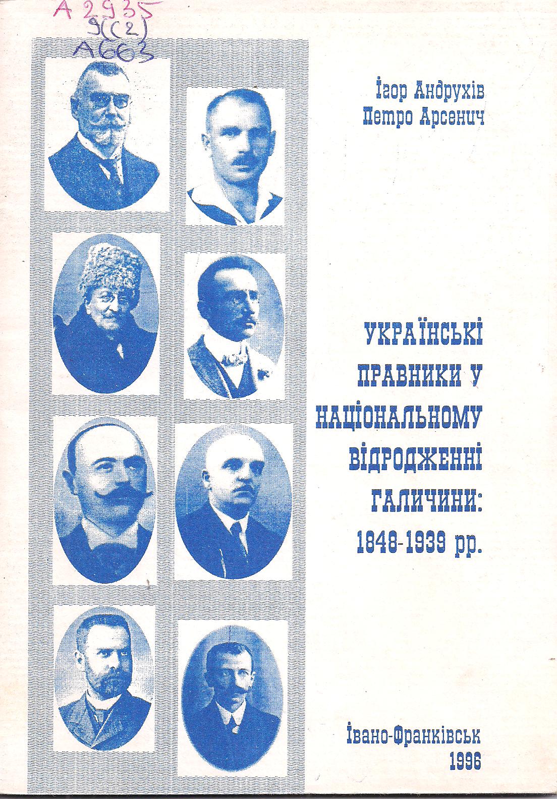 А2935/9(с2) А663 Андрухів І.О. Українські правники в національному відродженні Галичини 1848-1939 рр. / І. О. Андрухів, П. І. Арсенич ; Івано-Франківська обласна державна адміністрація, Управління культури. Науково-редакційний відділ, Обласна асоціація молодих істориків. – Івано-Франківськ : [б. в.], 1996. – 80 с. В цій книжці відображена історія національно-культурного відродження в Галичині в період так званої «адвокатської доби», де головну роль в культурно-освітньому, суспільно-політичному та економічному житті краю відігравали українські правники. Автори особливо звертають увагу на всесторонній характеристиці тих правників, життя і діяльність яких були тісно пов’язані зі Станиславівщиною в період 1848-1939 рр. |