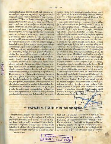 У статті (стр. 17 – 21) описано способи боротьби з тиграми — найнебезпечнішими хижаками в Індії. Тигрів ловлять у дерев’яні пастки з приманкою або підстрілюють отруєними стрілами з натягнутих луків, що спрацьовують при найменшому русі звіра. Отрута, якою натирають стріли, смертельна лише тоді, коли потрапляє в кров, і завдяки їй тигр гине за дуже короткий час.