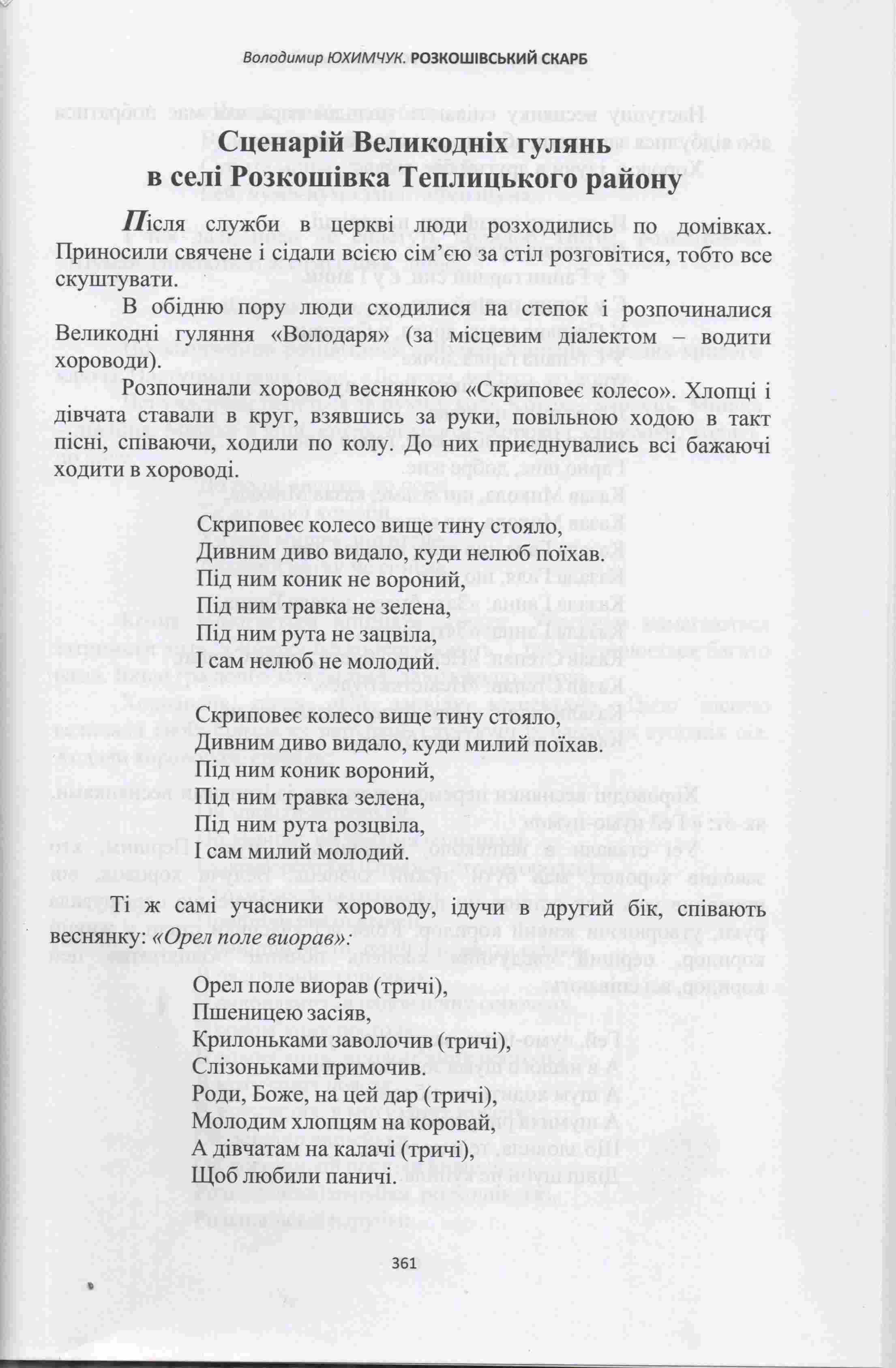 ристовують хороводні жартівливі, глузливі пісні, такі як: «Ой зацвіли вишеньки», «Ой як, як по садочку ходити». Ці та інші хороводні і хороводно-ігрові пісні повторюються декілька разів на день, протягом трьох днів. Третього дня на закінчення гуляння всі бажаючі учасники біжать так-званої «Довгої лози», починаючи від Степка, де відбувалось дійство, до центру села. Стає пара, взявшись за руки вище себе. Друга пара, пробігаючи попід підняті руки наперед, зупиняється, стає, як перша пара, піднявши руки і даючи можливість пробігти наступним. Всі разом роблять живий коридор. При цьому співають «Довгої лози» [Великоднє гуляння «Водити Володара» в селі Розкошівка Теплицького району Вінницької області. – URL: https://www.vocnt.org.ua/nkc/vodyty_volodary (дата перегляду: 24.12.2025)].