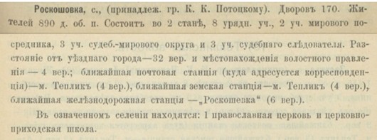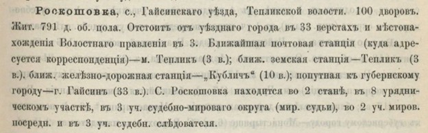 ків річки Теплички, притоки Удича (Гадича), Гайсинського повіту, пол. округу та ґміни Теплик, парафії Терновка, 39 верст від Гайсина, має 90 садиб, 516 мешканців, 859 десятин селянської землі, 52 десятини церковної. Церква святої Параскеви, збудована в 1766 р., має 787 парафіян. Належить до бубновецького ключа графині Олександри Потоцької.