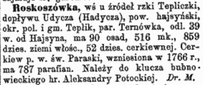Село Розкошівка (Roskoszówka) зафіксоване у Географічному словнику Королівства Польського та інших слов’янських країн, де зазначено, що Роскошовка (Roskoszówka), село біля вито