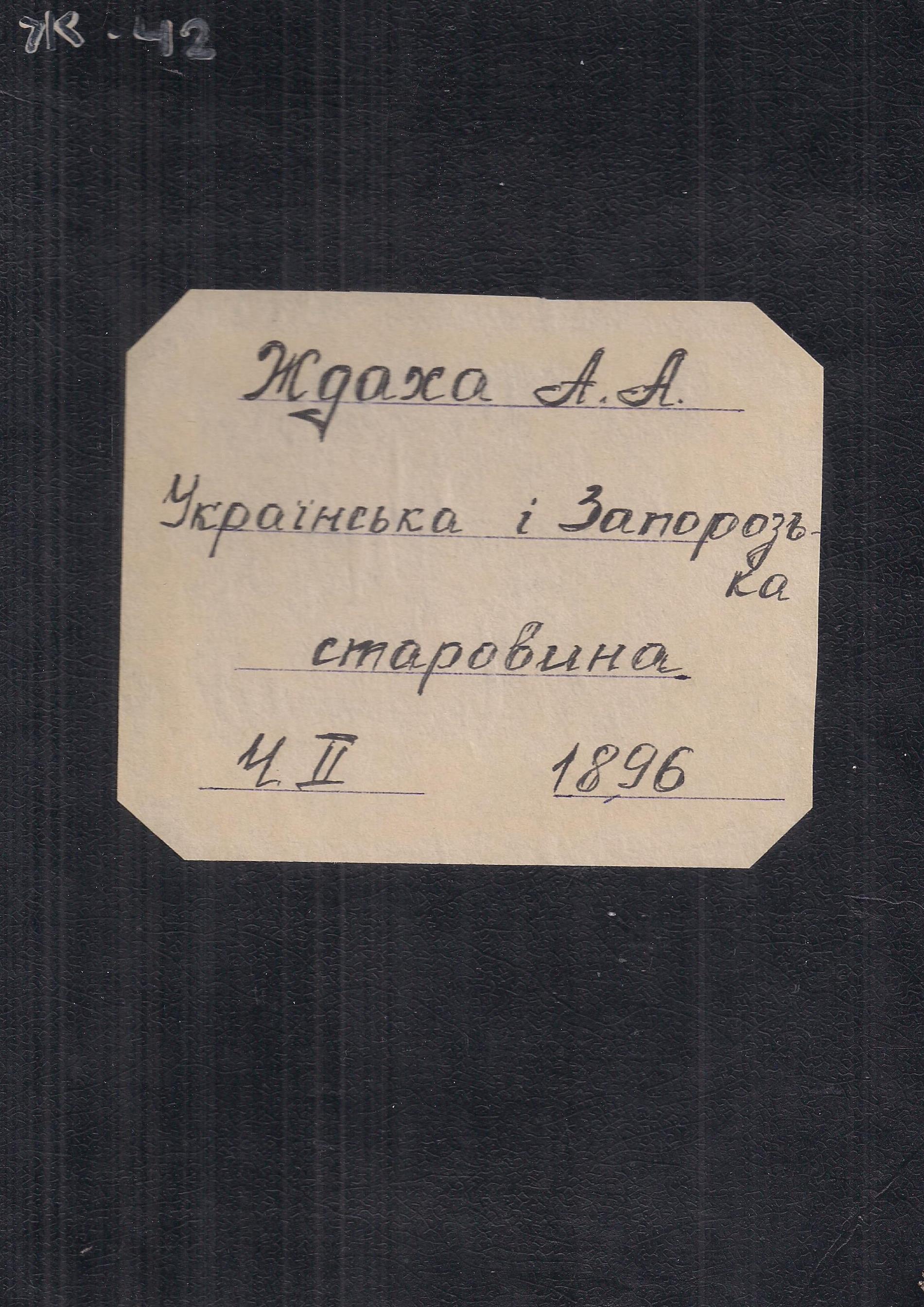 Ждаха, А. А. Українська і Запорізька Старовина. Ч. 2 / А. А. Ждаха. – Київ, 1896. – 360 с. : іл. – Рукописна книга.