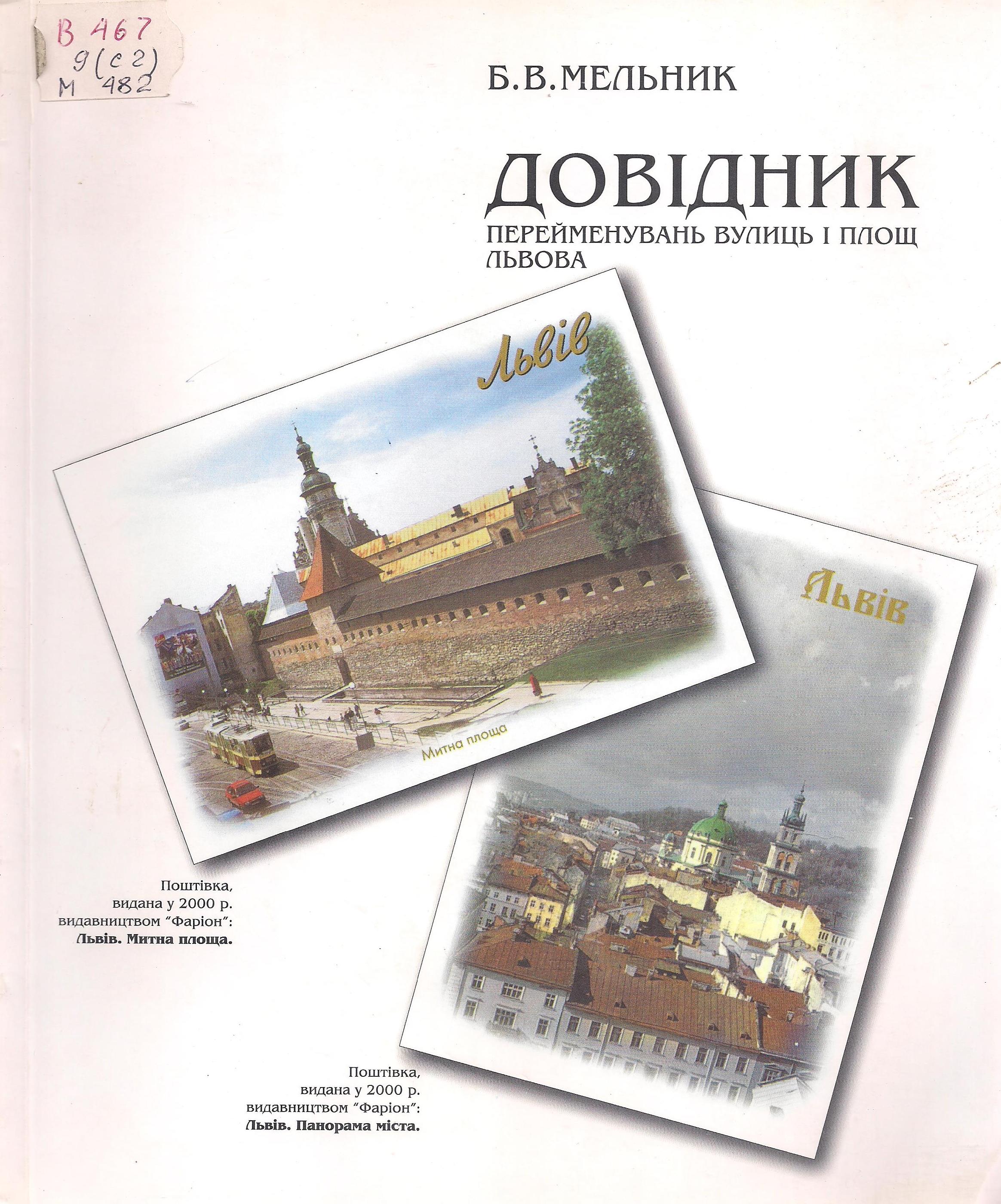 Мельник, Б. В. Довідник перейменувань вулиць і площ Львова. XIII-XX століття / Б. В. Мельник. – Львів : Світ, 2001. – 126 с.