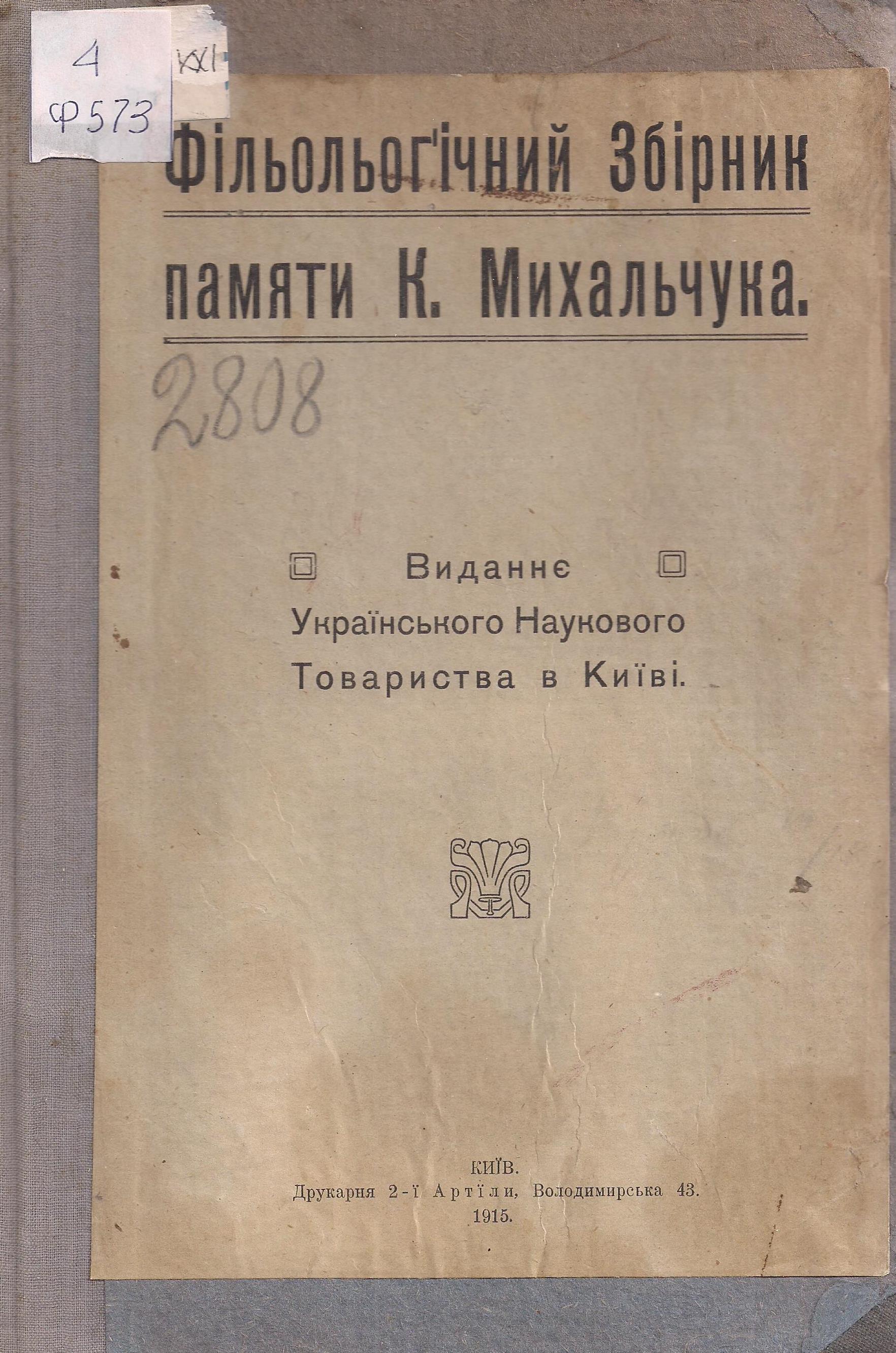 Фільольоґічний збірник памяти К. Михальчука. – Київ : Видання Українського Наукового Товариства в Києві (Друкарня 2-ї артілі), 1915. – 160 с. – Штамп : «Музей Антропології та Етнології ім. проф. Хв. Вовка».