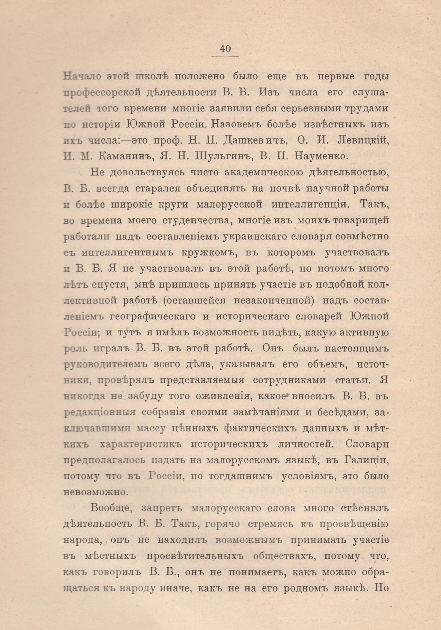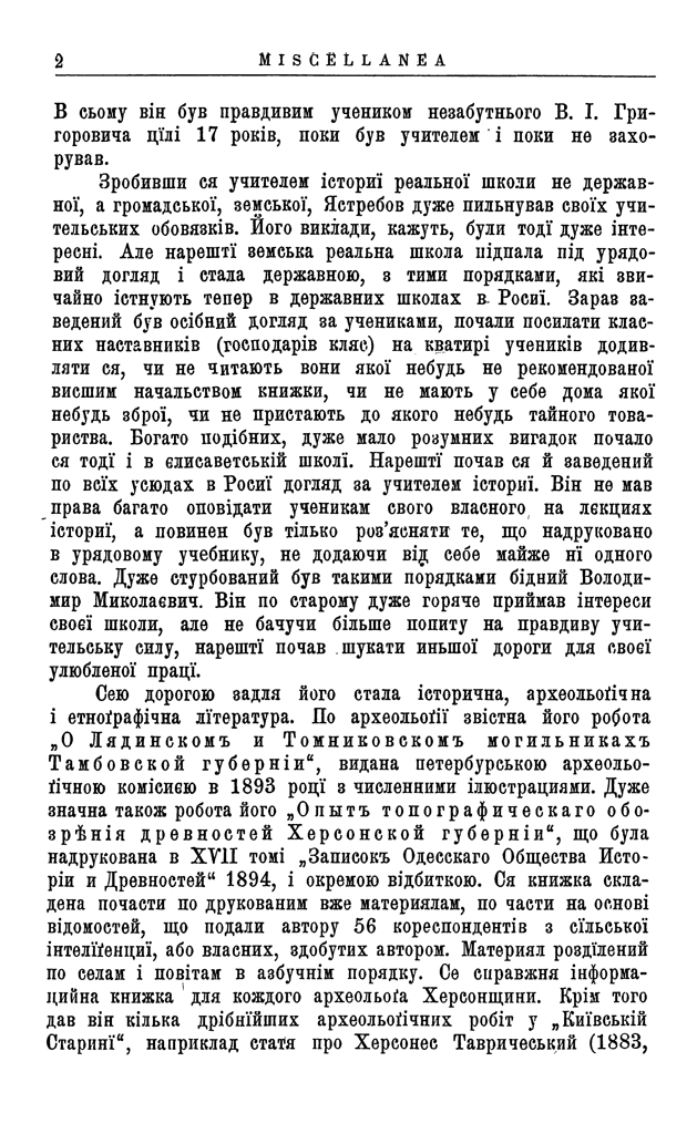 «[…] поступивши на історичний факультет Одеського університету, [В. Ястребов (1855-1899)] навчився добре приглядати до етнольогічних прикмет і бути прихильним і толерантним до кождої нациї. Кинутий після університету в Єлисавет в реальну школу, він зараз же пізнав осібний склад нашого народу та почав його студиювати. […] 17 років [В. Ястребов] був учителем істориї реальної школи не державної, а громадської, земської; дуже пильнував своїх учительських обов’язків. Його виклади, кажуть, були тоді дуже інтересні. Але нарешті земська реальна школа підпала під урядовий догляд і стала державною […] почався й заведений по всіх усюдах в Росиї догляд за учителем істориї. Він не мав права багато оповідати ученикам свого власного на лекциях істориї, а повинен був тілько роз’ясняти те, що надруковано в урядовому учебнику. [Тож В. Ястребов] почав шукати иньшої дороги для своєї улюбленої праці. Сею дорогою задля його стала історична, археольогічна і етнографічна література. Дуже значна […] робота його «Опытъ топографическаго обозрѣнія древностей Херсонской губерніи», що була надрукована в XVII томі «Записокъ Одесскаго Общества Исторіи и Древностей» 1894 року. Він запримітив, що Херсонська ґубернїя має дуже ріжний етноґрафічний склад людности. Більшість людности – Українці, але поруч з ними живуть і Білорусини […] і Молдаване і Німці і Поляки і Жиди і Греки і Болгаре, зібравшися сюди з давньої України – Київщини, і з Слобідської України – Харківщини, і […] з Прусиї і з Віртемберга, і з острова Даїо, і з Туреччини, і з Македонії, і з Руминії. […] деякі з сих народів прихиляються до Українців, приймають їх мову, от як Молдаване, Болгари, почасти Поляки з Галичини і з нашої правобічної України, иньші – як Нїмцї, Жиди, держаться своєї народности, одначе всі балакають по українськи, і ся українська мова стала межинародньою мовою […]».
