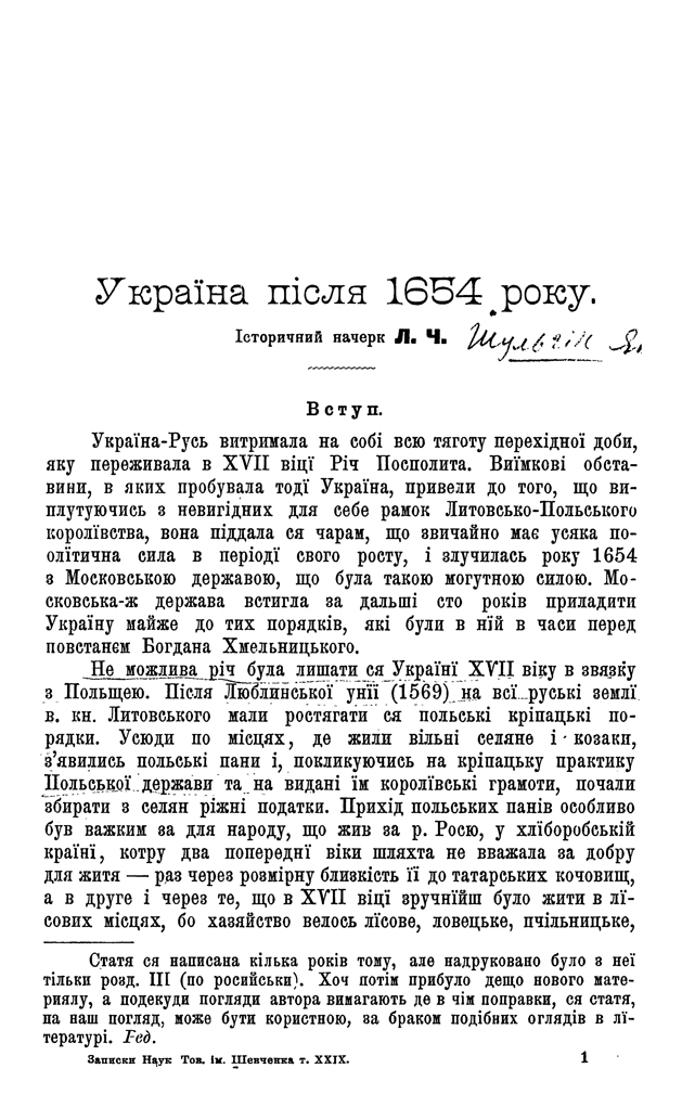 Л. Ч.* [Шульгин, Яків]. Україна після 1654 р. : історичний начерк / Яків Шульгин // Записки Наукового товариства ім. Шевченка. – Кн. ІІІ. – Т. XXIX. – Львів, 1899. – С. 1-13.