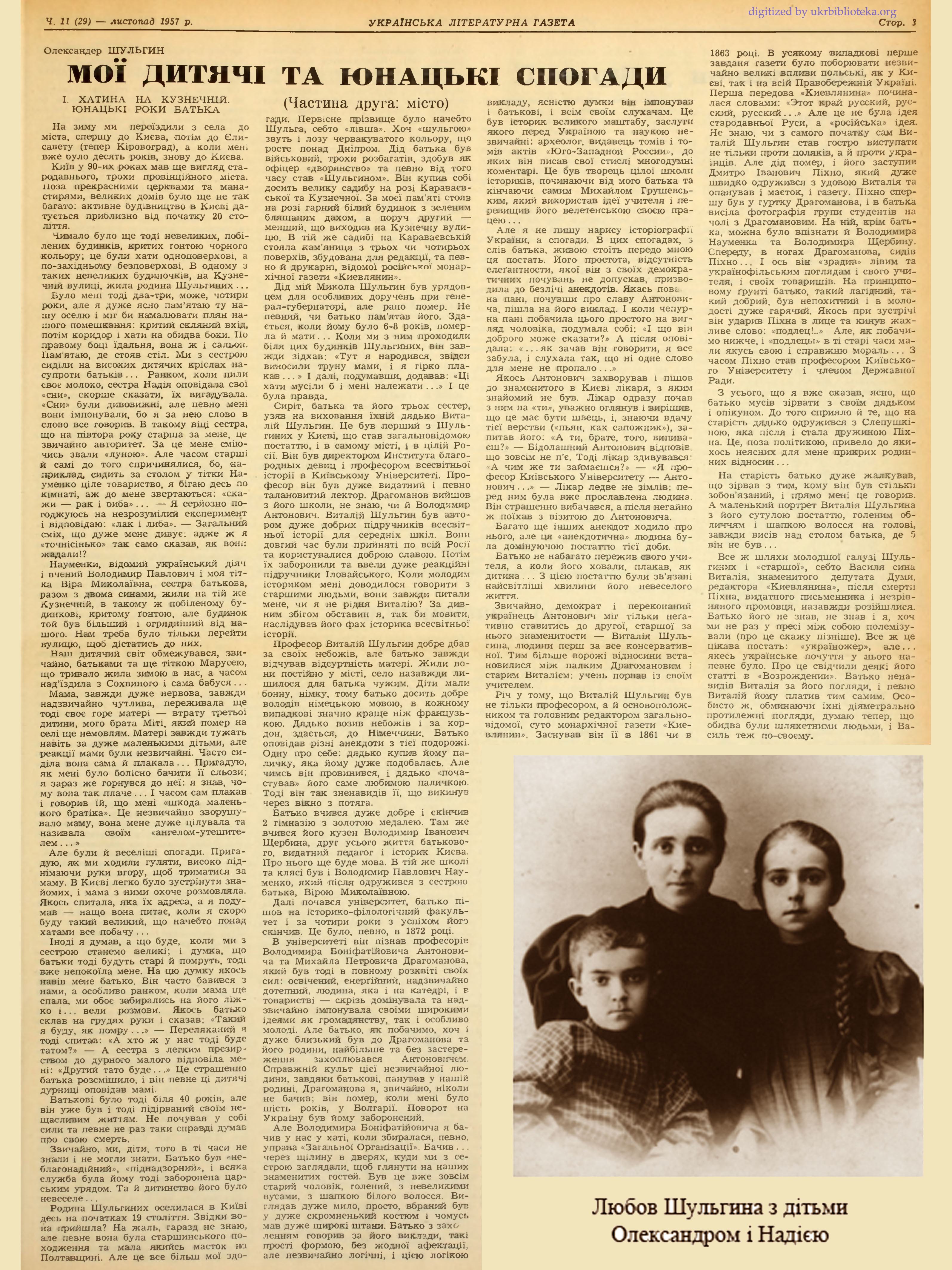 Два джерела: дитячі та юнацькі спогади Олександра, старшого сина Якова Миколайовича, та оповідь київського історика Володимира Щербини про його незабутнього друга Я. М. Шульгина, – стали своєрідними путівниками при підготовці цього матеріалу.