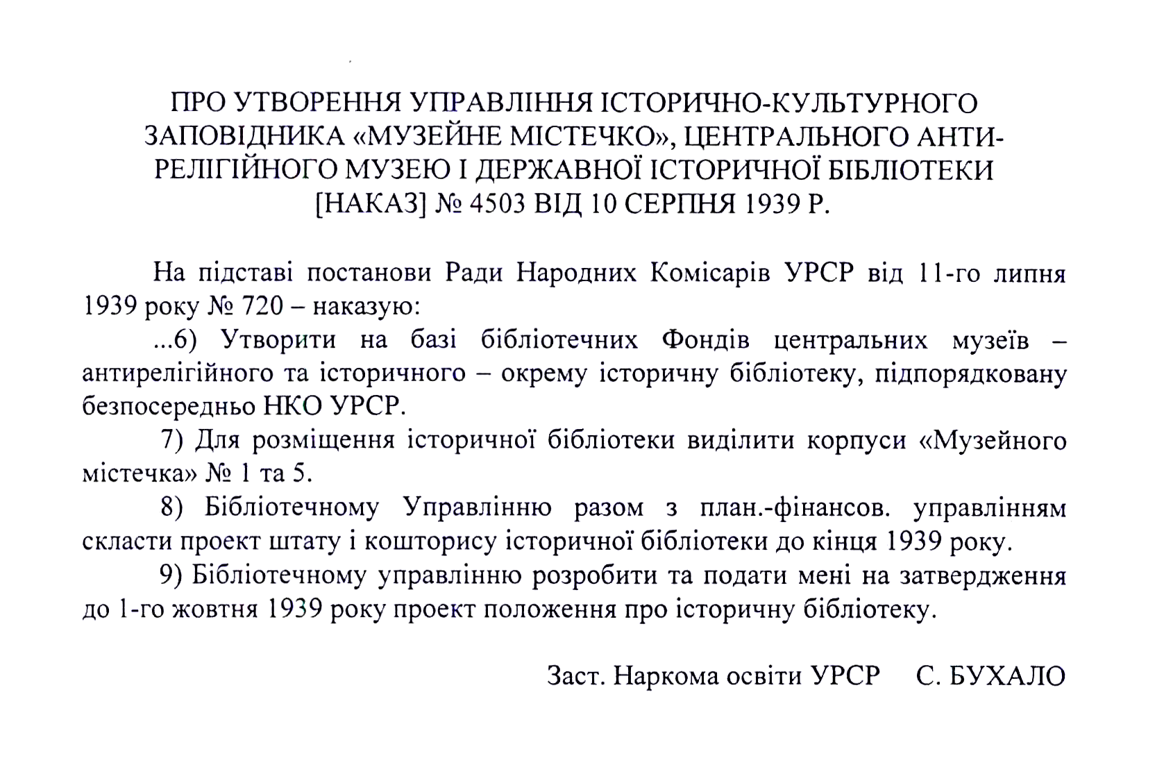 4.09. На підставі наказу РНК УРСР за № 4740 1939 року «Про організацію Державної історичної бібліотеки» почала своє існування Державна історична бібліотека у м. Києві, нині – Національна історична бібліотека України (НІБУ), директором якої був призначений Андрій Решетніков. Для розміщення Бібліотеки виділено корпуси «Музейного містечка» № 1та 5.